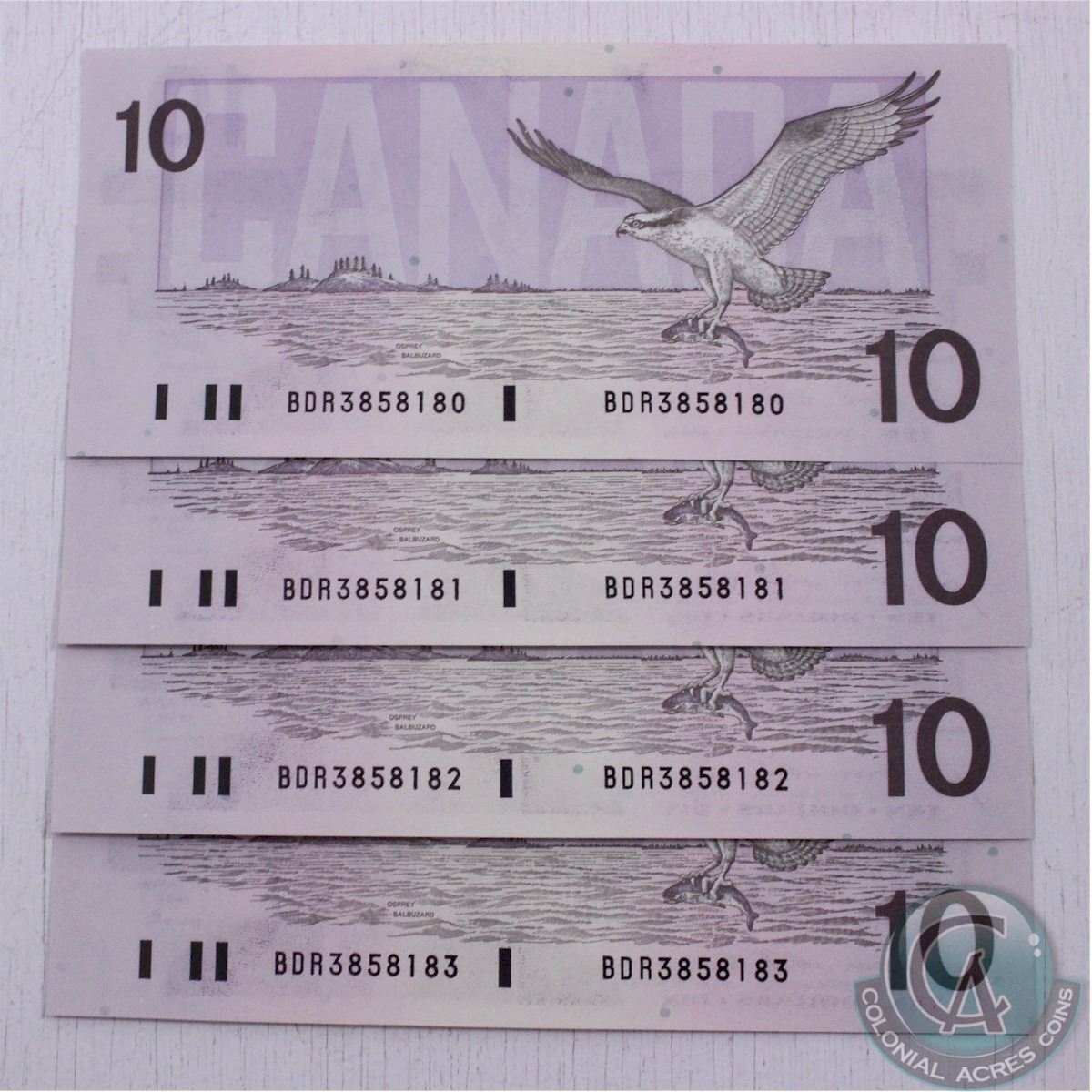 4 x 1989 $10.00 notes with consecutive serial numbers in UNC Condition.