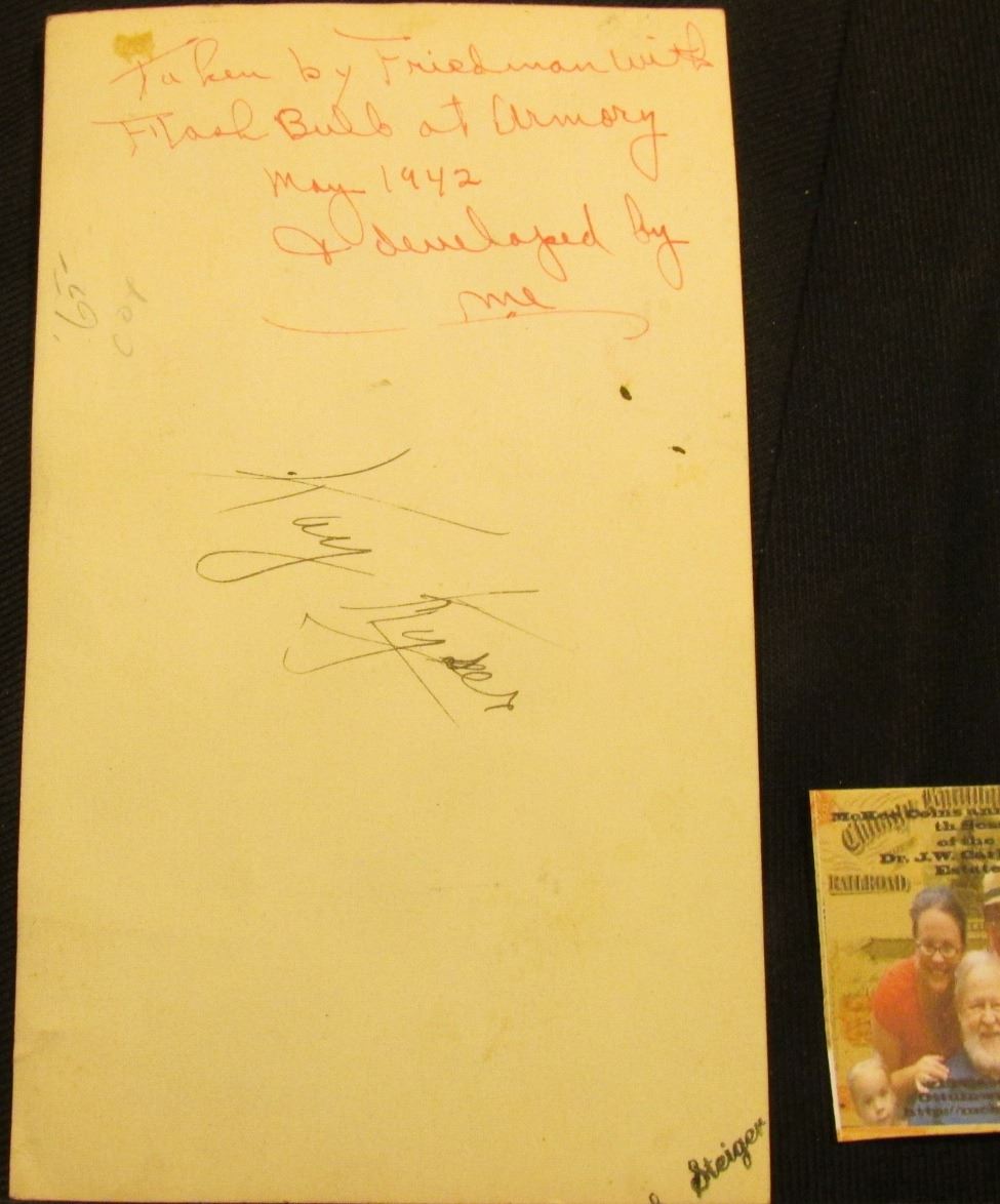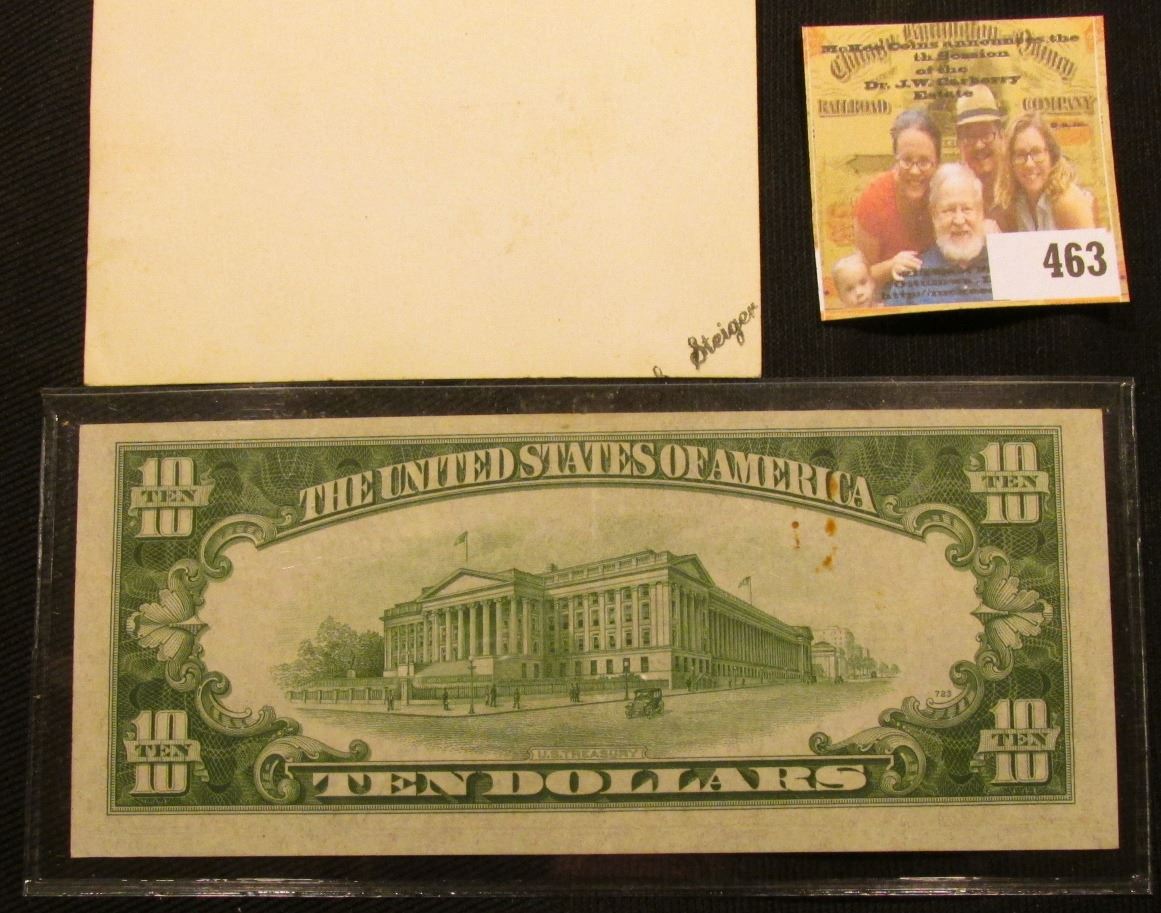 4" x 6 3/4" Black & White photo of Kay Kyser greeting a gal in front of a microphone, back states "Taken by Friedman with Flash Bulb at Armory May 1942 & developed by me - Kay Kyser". Included in this lot is a Series 1934A Ten Dollar Federal Reserve Note from St. Louis, Mo., EF with a minor rust area probably from an old paper clip.