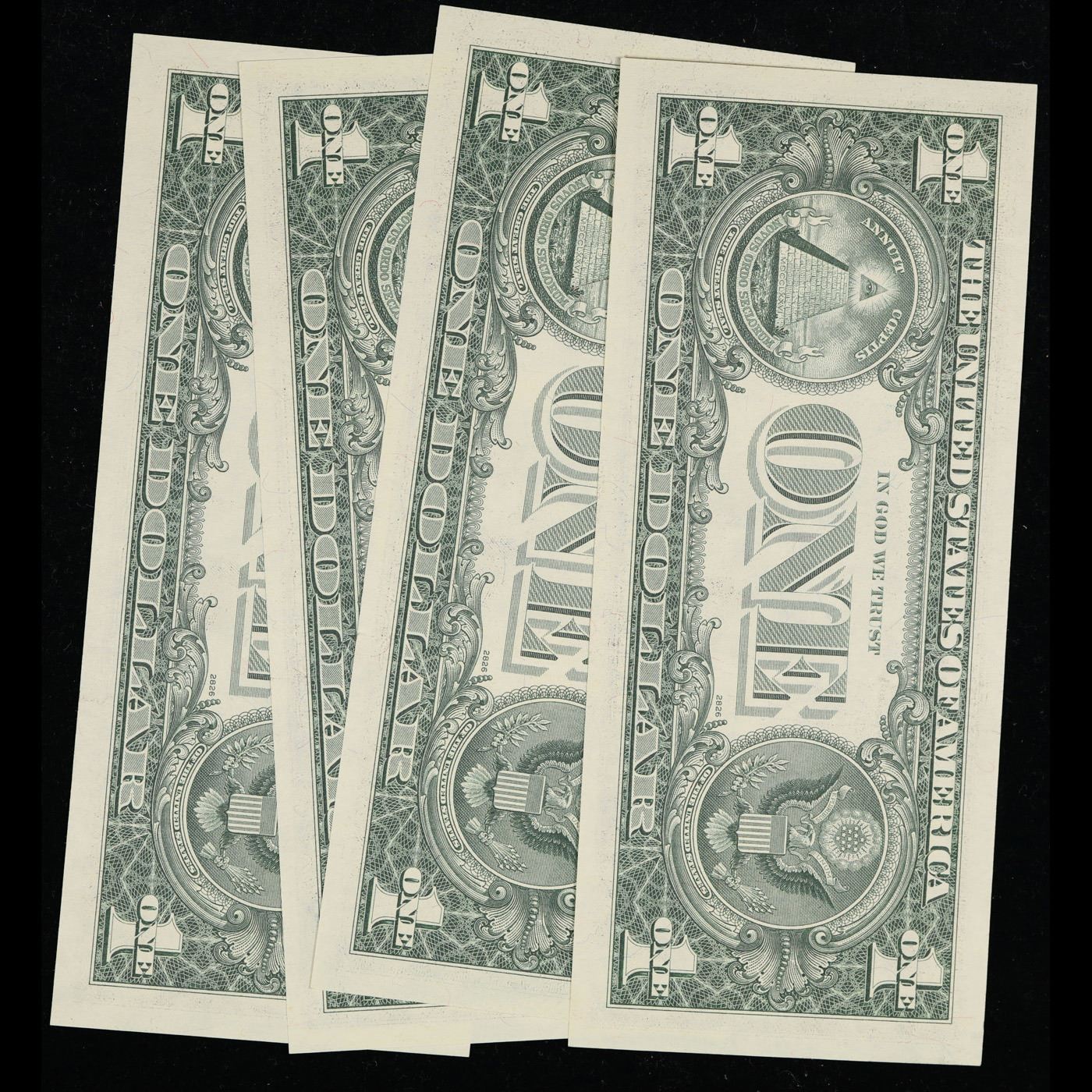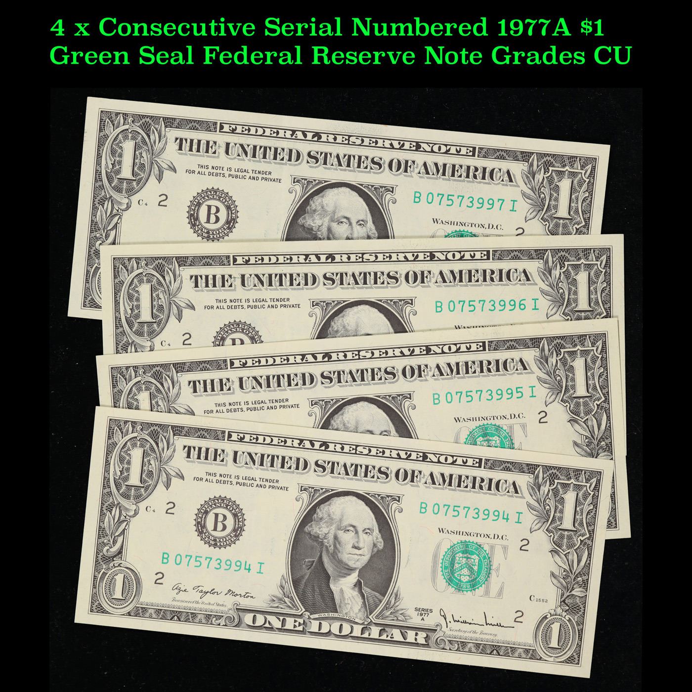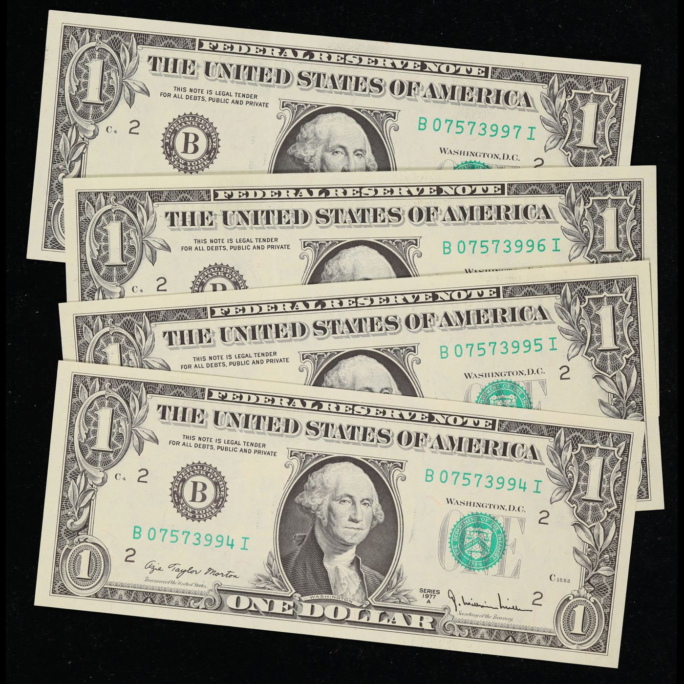4 x Consecutive Serial Numbered 1977A $1 Green Seal Federal Reserve Note Grades CU.
