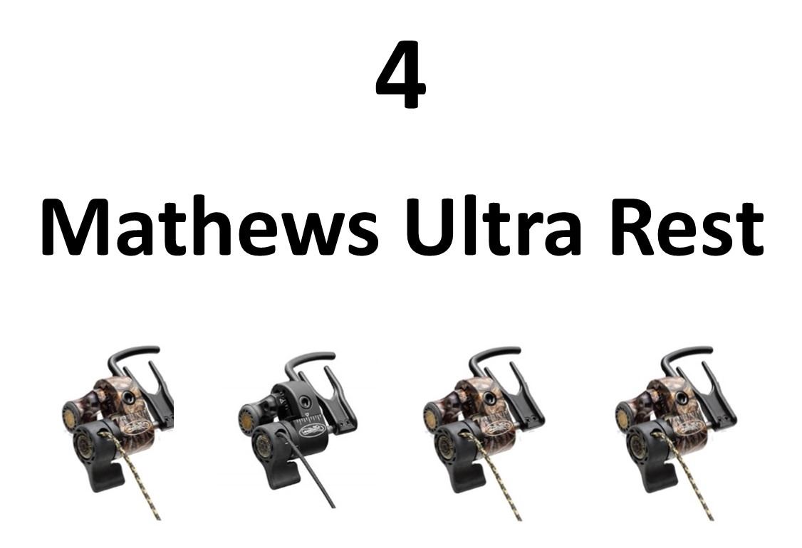 4 x Mathews Rests, 2-Mathews Ultra Rest Lost LH, 1-Mathews Ultra Rest LH Black, 1-Mathews Ultra Rest Lost XD LH