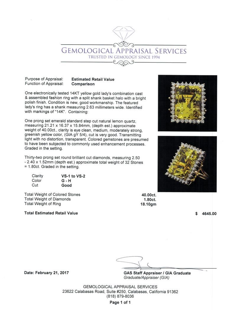 One electronically tested 14KT yellow gold lady's combination cast & assembled fashion ring with a split shank basket halo with a bright polish finish. The featured lady's ring has a shank measuring 2.63 millimeters wide. Identified with markings of '14K'. Condition is new, good workmanship. Containing: One prong set emerald standard step cut natural lemon quartz, measuring 21.21 x 16.37 x 15.84mm, (depth est.) approximate weight of 40.00ct., clarity is eye clean, medium, moderately strong, greenish yellow color, (GIA gY 5/4), cut is very good. Transmitting light with no distortion, transparent. Colored gemstones are presumed to have been subjected to commonly used enhancement processes. Graded in the setting. Thirty-Two prong set round brilliant cut diamonds, measuring 2.50 - 2.40 x 1.52mm (depth est.) approximate total weight of 32 Stones = 1.80ct. Graded in the setting. Clarity VS-1 to VS-2. Color: G - H Cut Good. Total Weight of Colored Stones 40.00ct.. Total Weight of Diamonds 1.80ct.. Total Weight of Ring 18.10gm GAS Appraised at $4,645.00.