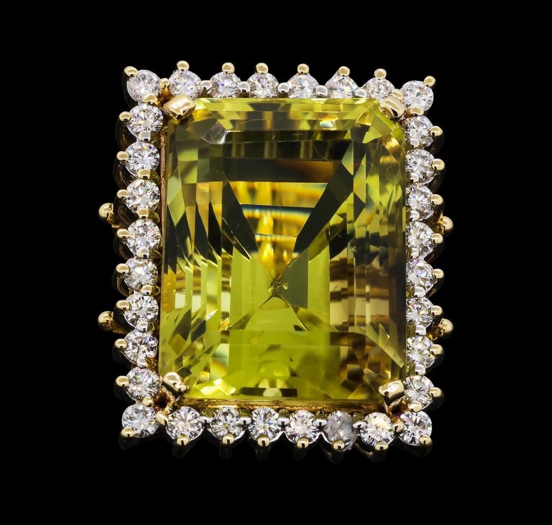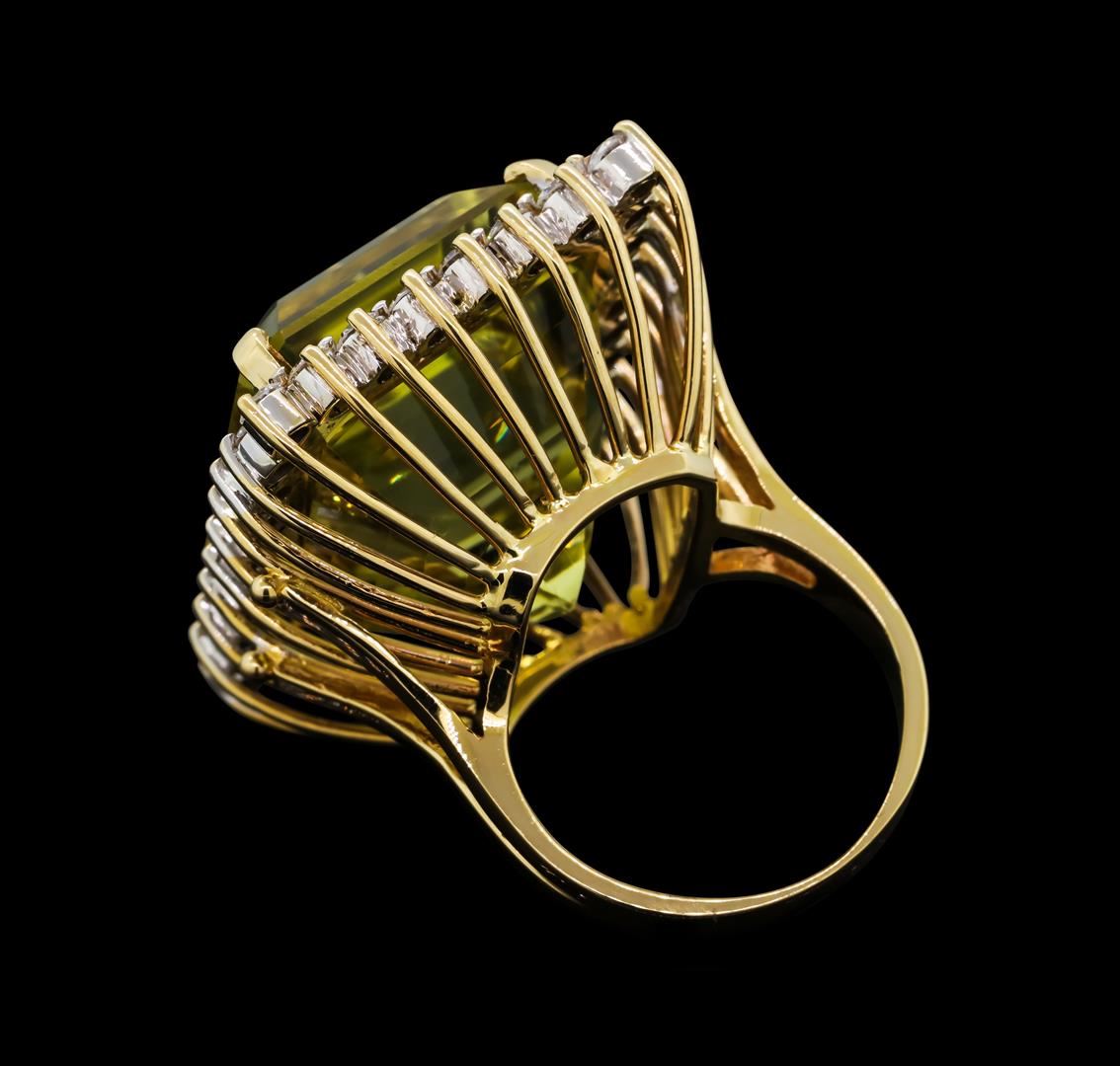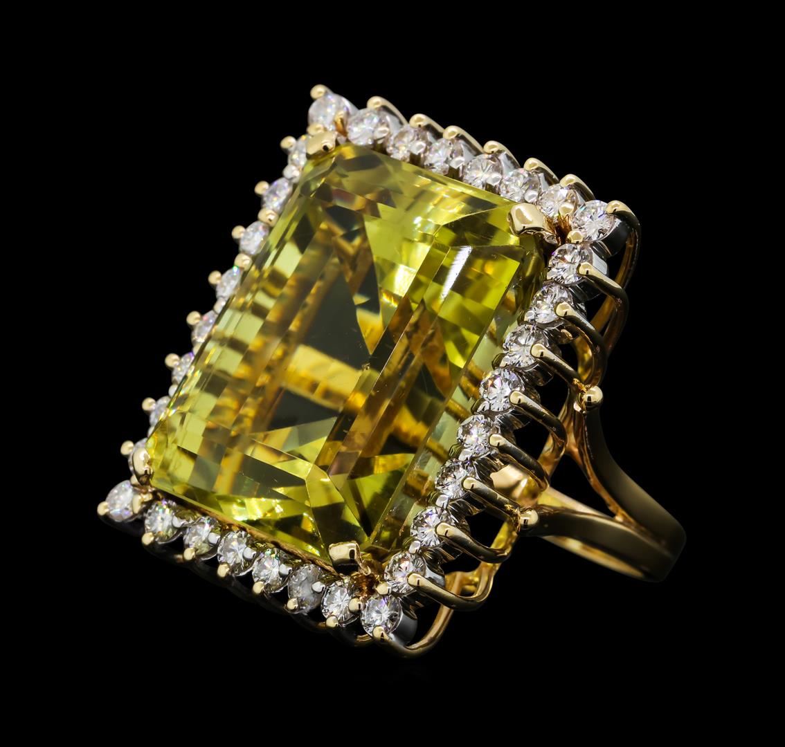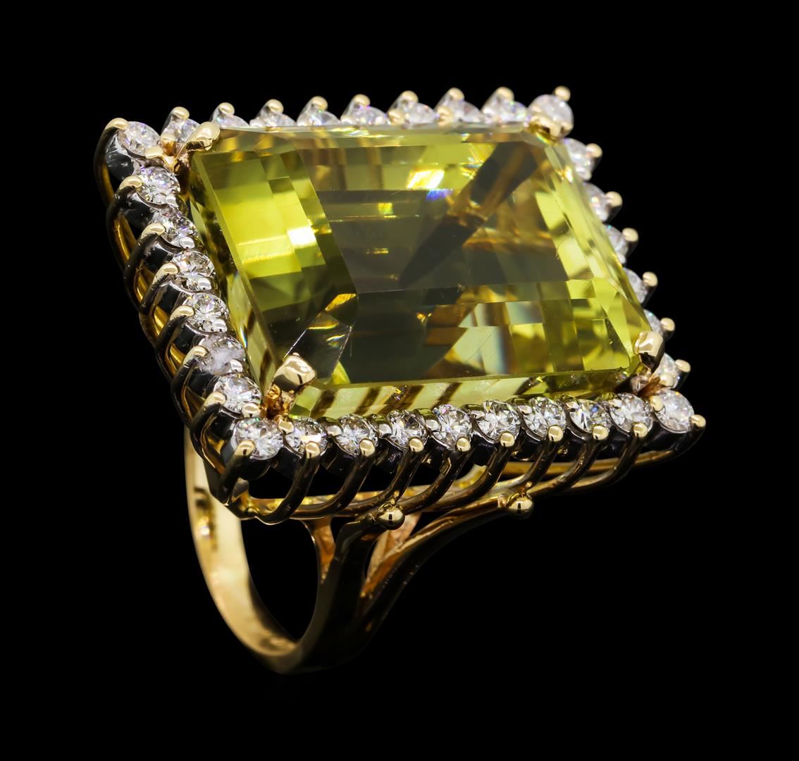 One electronically tested 14KT yellow gold lady's combination cast & assembled fashion ring with a split shank basket halo with a bright polish finish. The featured lady's ring has a shank measuring 2.63 millimeters wide. Identified with markings of '14K'. Condition is new, good workmanship. Containing: One prong set emerald standard step cut natural lemon quartz, measuring 21.21 x 16.37 x 15.84mm, (depth est.) approximate weight of 40.00ct., clarity is eye clean, medium, moderately strong, greenish yellow color, (GIA gY 5/4), cut is very good. Transmitting light with no distortion, transparent. Colored gemstones are presumed to have been subjected to commonly used enhancement processes. Graded in the setting. Thirty-Two prong set round brilliant cut diamonds, measuring 2.50 - 2.40 x 1.52mm (depth est.) approximate total weight of 32 Stones = 1.80ct. Graded in the setting. Clarity VS-1 to VS-2. Color: G - H Cut Good. Total Weight of Colored Stones 40.00ct.. Total Weight of Diamonds 1.80ct.. Total Weight of Ring 18.10gm GAS Appraised at $4,645.00.