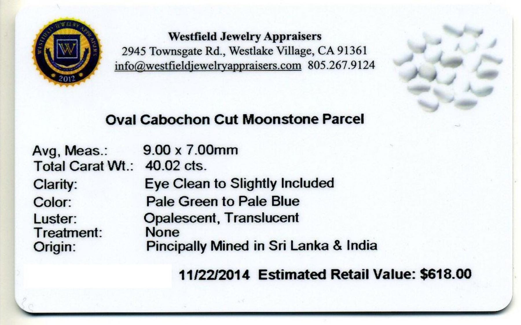40.02ctw. Oval Cabochon Cut Moonstone Parcel. Westfield Appraised.