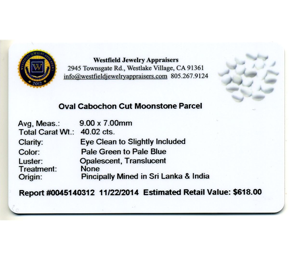 40.02ctw. Oval Cabochon Cut Moonstone Parcel. Westfield Appraised at $618.00.
