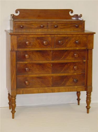 40 1/2" EMPIRE MAHOGANY 2 OVER 3 DRAWER CHEST W/ A 2 DRAWER DECK TOP, CARVED SQUARE POSTS, & 3 PART SHAPED BACKSPLASH - IMPERFECTIONS