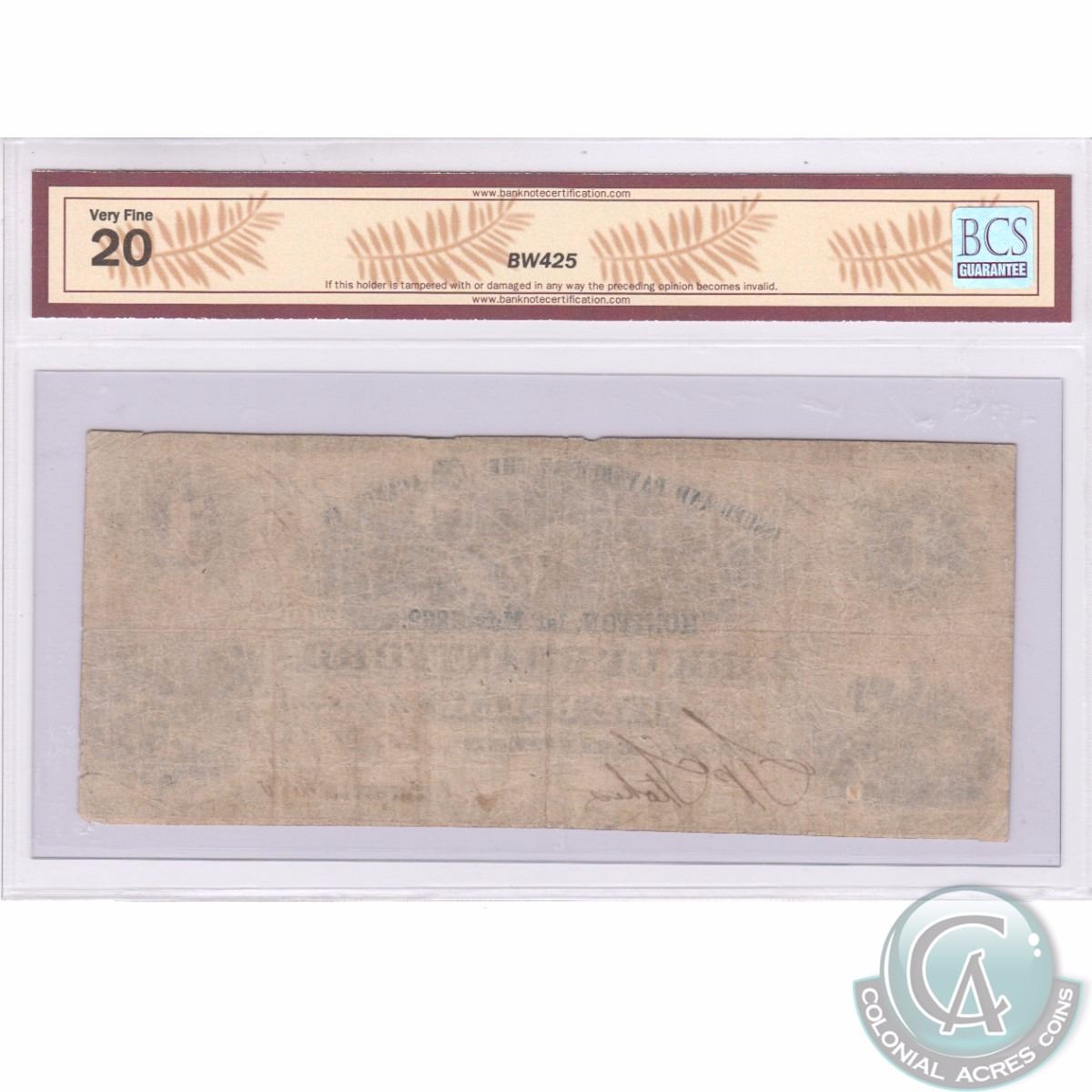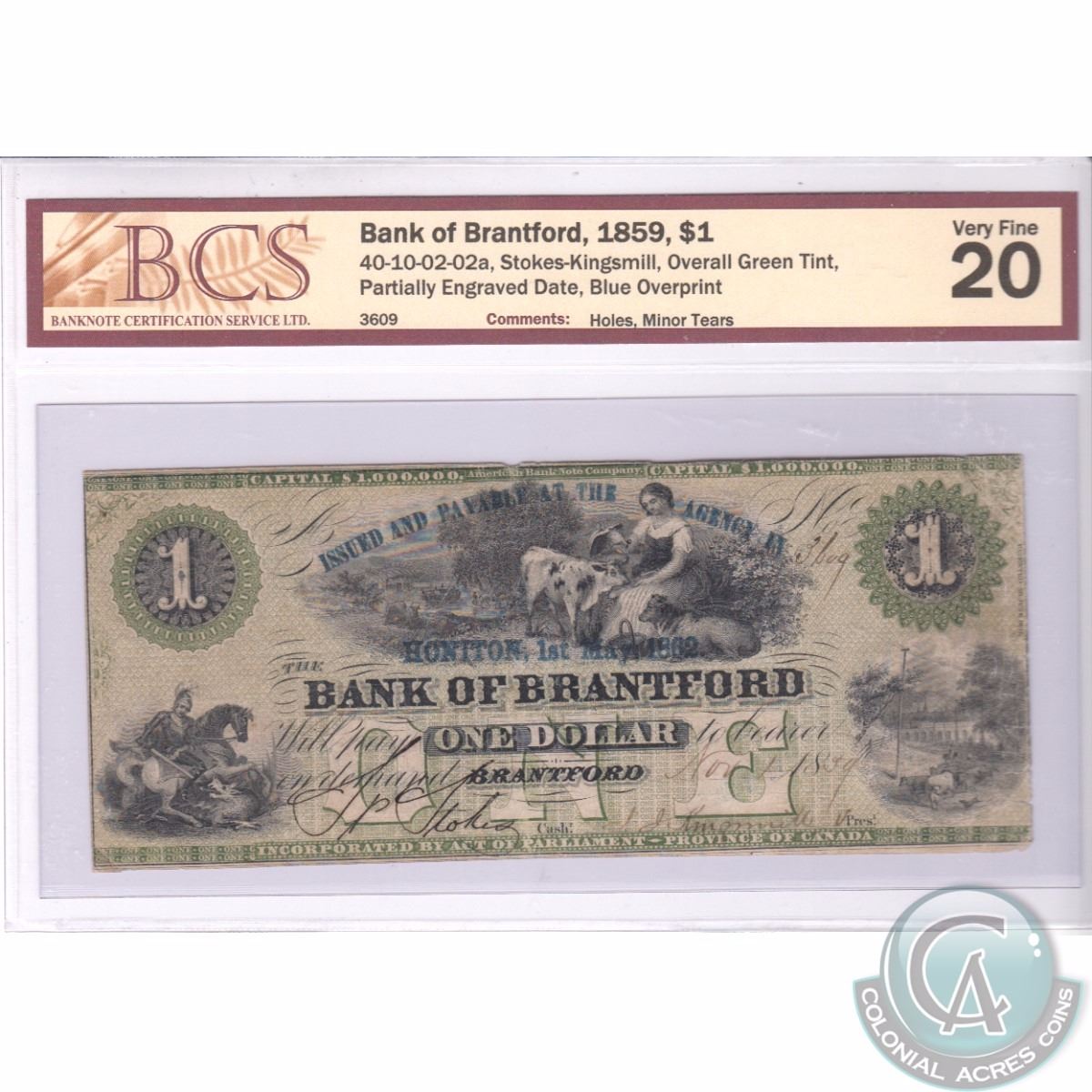 40-10-02-02a. 1859 Bank of Brantford $1, Stokes-Kingsmill, Overall Green Tint, Partially Engraved Date with Blue Overprint, S/N: 3609, BCS Certified VF-20 (holes, minor tears)