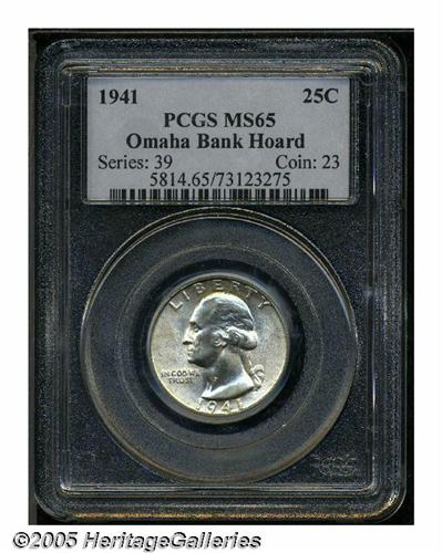 <B>(40) 1941<25C> MS65 PCGS.</B></I> Ex: Omaha Bank Hoard. Two pieces are FS-012.9 and exhibit noticeable die doubling on the motto and the 19 in the date. Most of these Gems are lightly toned and well preserved, a few have deeper russet color or have a few luster grazes. Several pieces are well struck, while others show slight softness on a few of the legends near the margins.