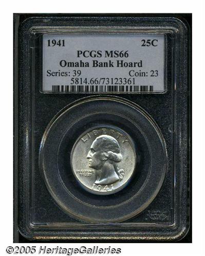 <B>(40) 1941<25C> MS66 PCGS.</B></I> Ex: Omaha Bank Hoard. A few pieces have attractive medium gold and gray colors, however, most of the premium Gems are only faintly to lightly toned. A lovingly preserved assemblage, several show the usual indistinctness of strike on the legends near the borders.