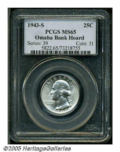 <B>(40) 1943-S<25C> MS65 PCGS.</B></I> Ex: Omaha Bank Hoard. A brilliant to lightly toned certified roll, the coins are crisply struck in the centers but have typical definition on the peripheral legends. One example has a couple of noticeable marks on the right (facing) wing, but most pieces are generally splendidly preserved. One of the Gems has a decidedly prooflike obverse.