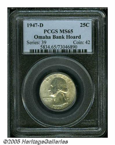 <B>(40) 1947-D<25C> MS65 PCGS.</B></I> Ex: Omaha Bank Hoard. A moderately toned and lustrous certified roll, the majority of the Gems display medium chestnut color. One example has interesting 'die rust' on the portrait, as made. Most coins are well struck, some pieces show the expected softness on the peripheral legends. A couple of pieces exhibit noticeable marks, however, the typical Gem is very pleasing.