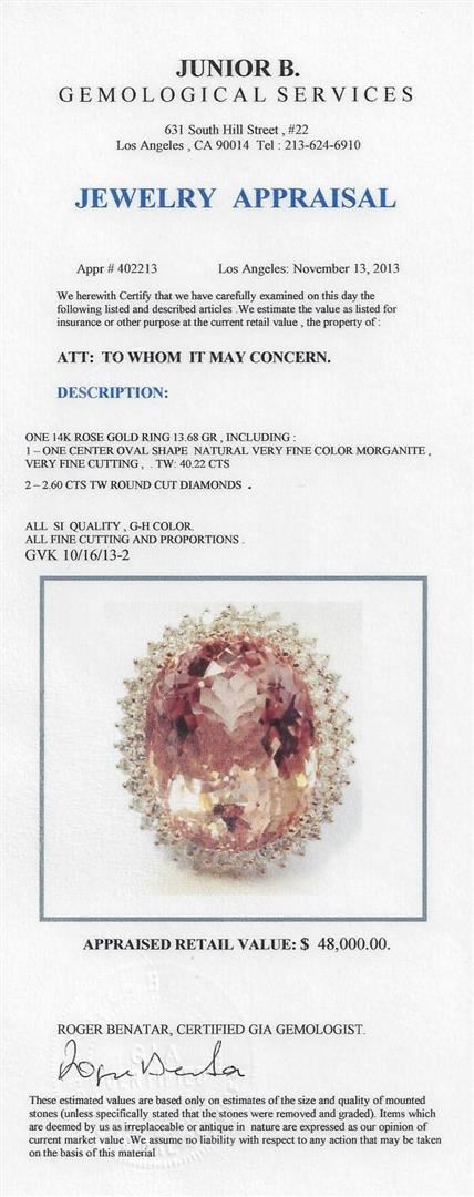 One 14KT Rose Gold ring 13.69 GR Including: one center oval shape natural very fine color morganite, very fine cutting. TW 40.22 CTS. 2.60 CTS TW round cut diamonds. All SI Clarity, G-H Color. Fine Cutting and Proportions. RBGS Appraised at $48,000.00.