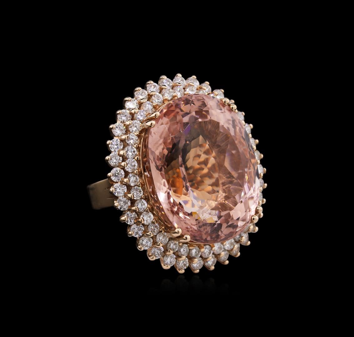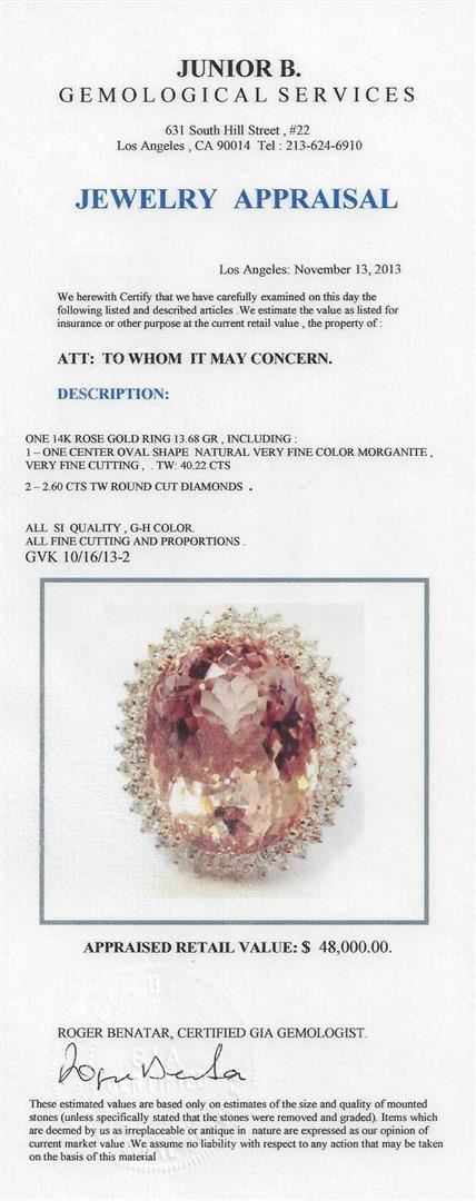 One 14KT Rose Gold ring 13.69 GR Including: one center oval shape natural very fine color morganite, very fine cutting. TW 40.22 CTS. 2.60 CTS TW round cut diamonds. All SI Clarity, G-H Color. Fine Cutting and Proportions. RBGS Appraised at $48,000.00.
