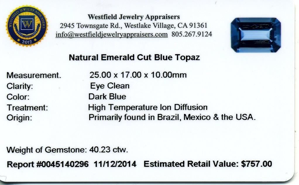 40.23ctw. Natural Emerald Cut Blue Topaz. Westfield Appraised at $757.00.