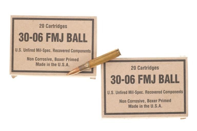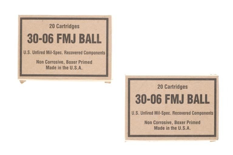 Featured in this lot is this40 30-06 FMJ ball U.S. Unfired Mil-Spec. Recovered ammunition. There are two boxes of 20 rounds a piece at a total of 40 rounds in this colleciton. The condition of these two boxes of ammunition is good with no obvious signs of damage and shows good overall condition. The measurements of these boxes of ammunition is 3 3/8" x 5" x 1". The collective weight of this box of ammunition is 2lb 6oz.