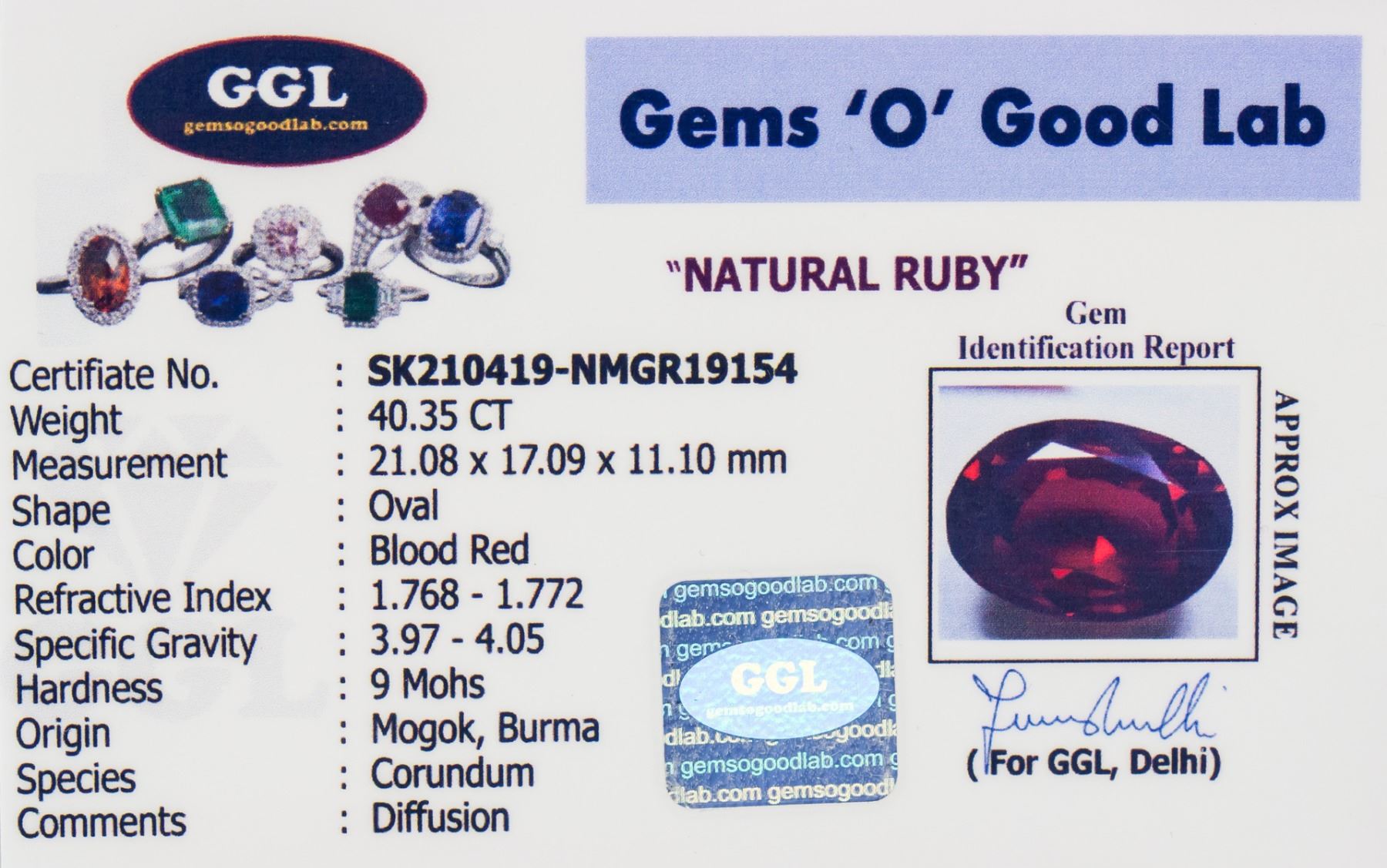 One (1) 40.35 ct oval cut blood red natural ruby. Origin: Mogok, Burma. Accompanied with GGL certificate. 21.08 x 17.09 x 11.10 mm.