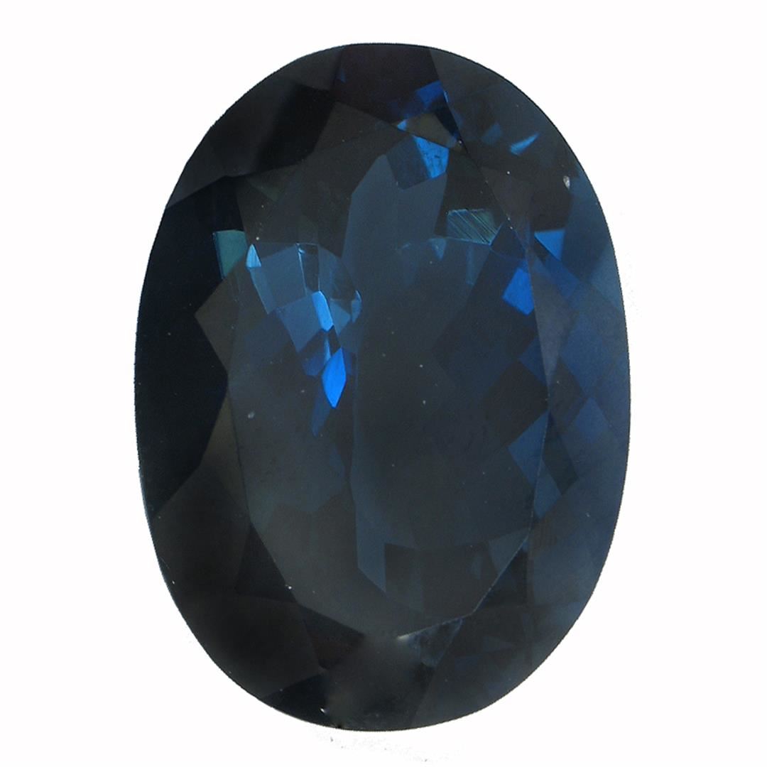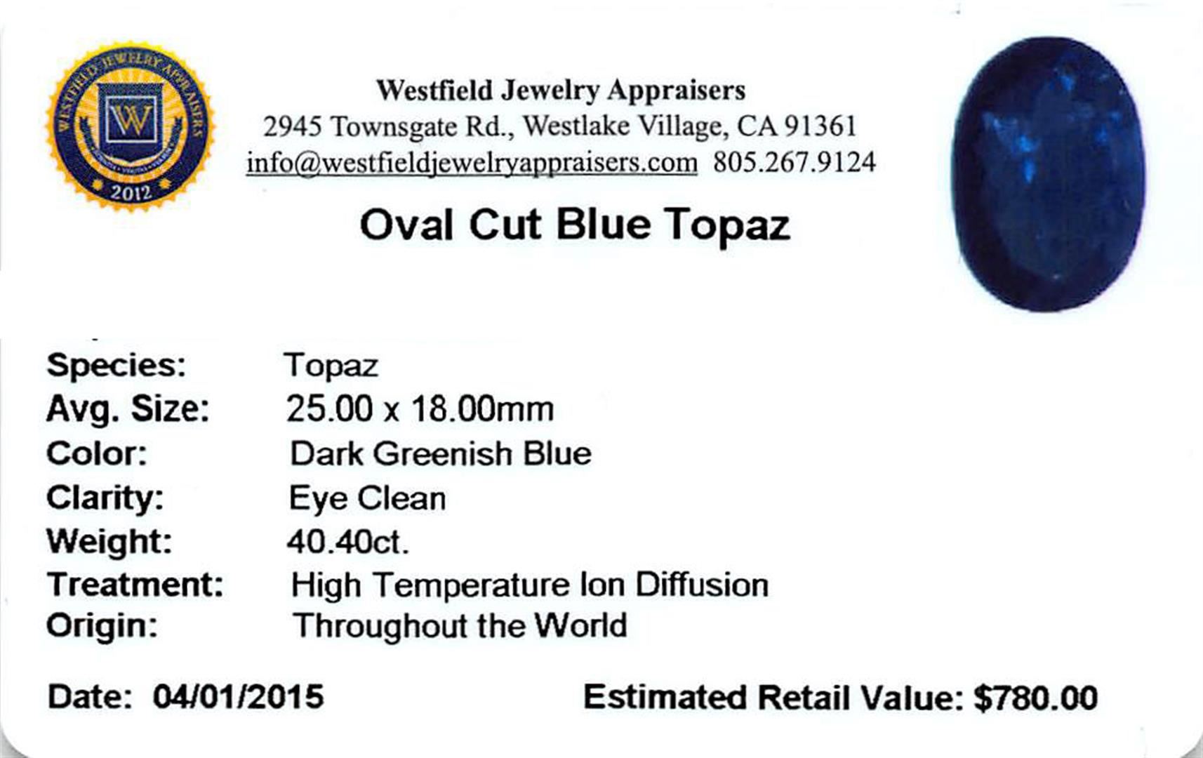One oval cut natural blue topaz exact weight 40.40ct., clarity is eye clean, type I, dark, very slightly grayish, greenish blue color, (GIA gB 7/3), cut is good. Westfield Appraised.