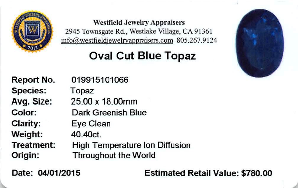 One oval cut natural blue topaz exact weight 40.40ct., clarity is eye clean, type I, dark, very slightly grayish, greenish blue color, (GIA gB 7/3), cut is good. Westfield Appraised at $780.00.