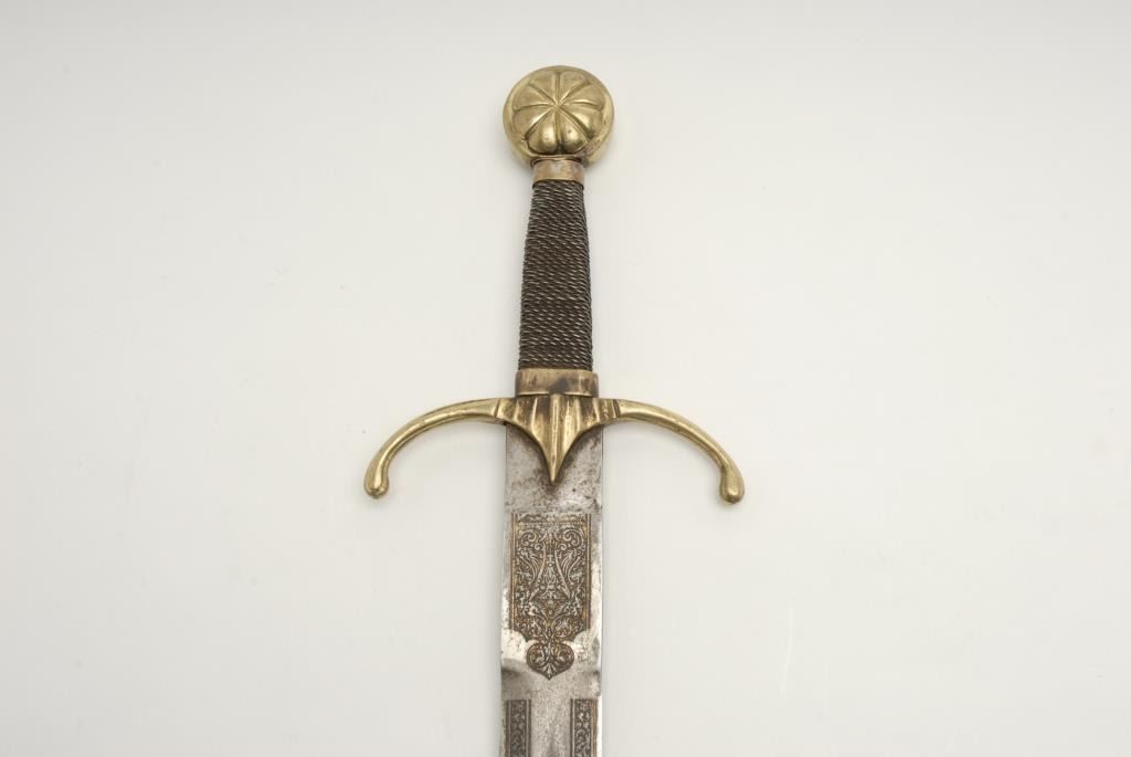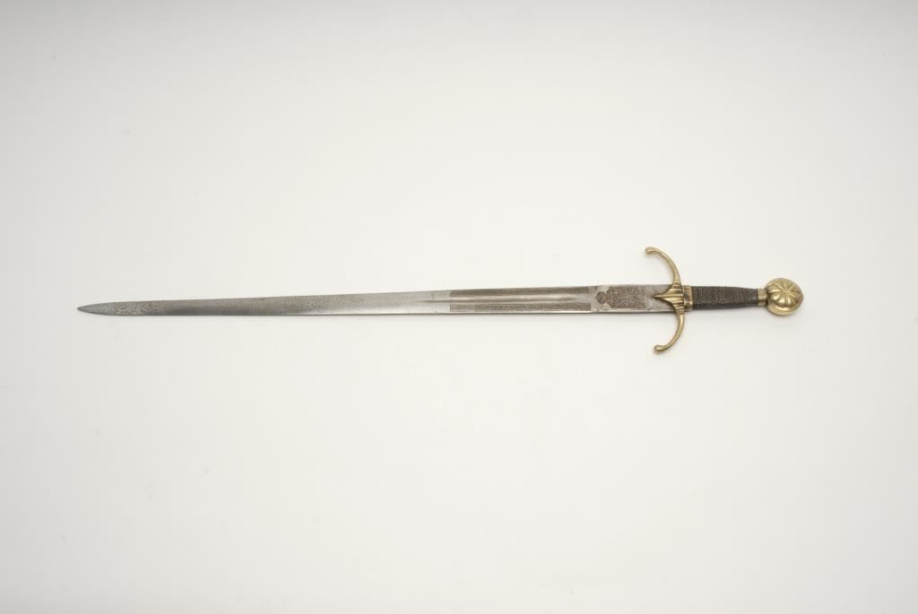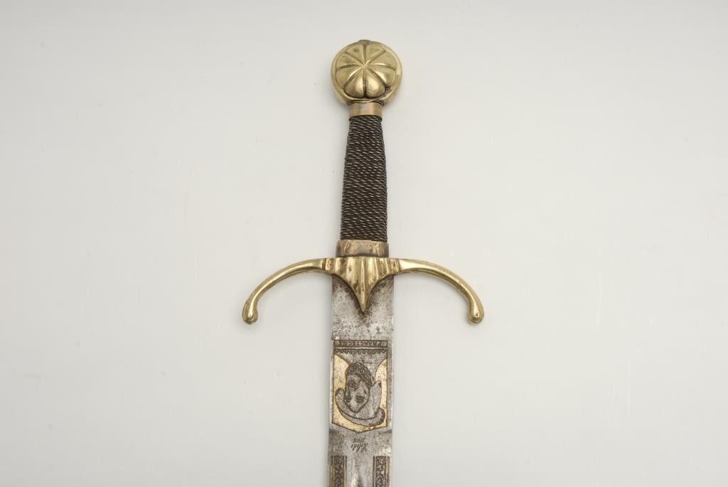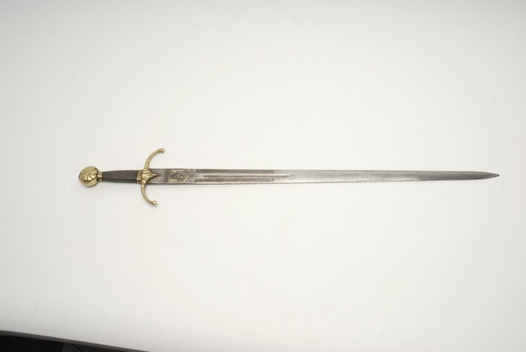 40-60 year old Toledo copy of famous knightly sword with etched blade. Shows man’s portrait and name “Francisco I”. Measures 41 ½” overall. Not to be confused with the cheap quality of the last 30 years. This is a nicely made sword with atempered blade and good weight and balance. Est.: $300-$600