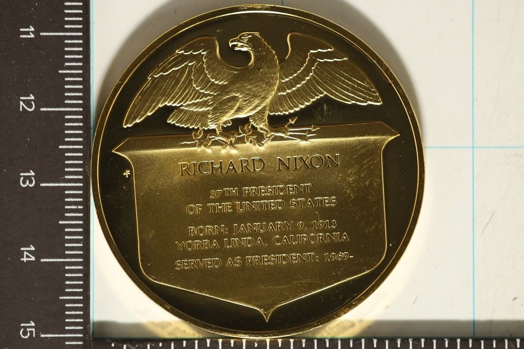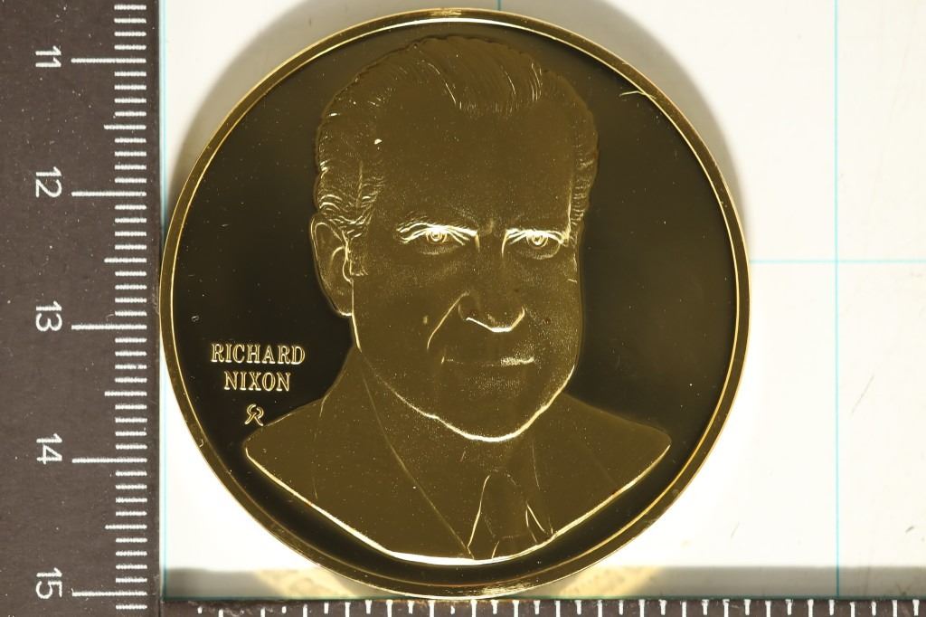 NIXON 37TH PRESIDENT OF THE US, BORN JAN. 9TH, 1913 SERVED AS PRESIDENT 1969. OFFICIAL WHITEHOUSE HISTORICAL ASSOCIATION ROUND, MIRRORED BACKROUND, IN HARD PLASTIC CAPSULE, EDGE MARKED