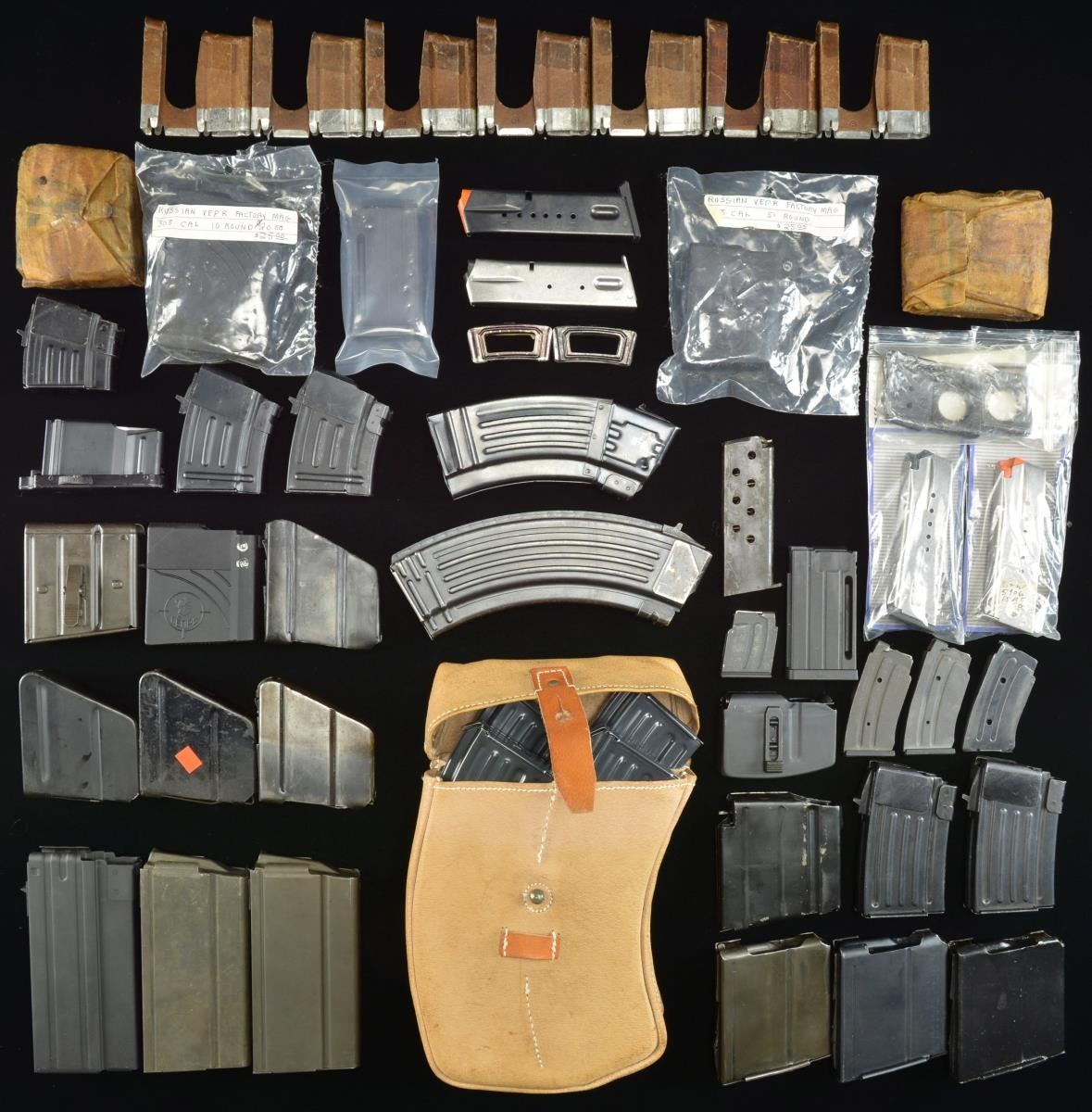 Assortment of rifle & pistol magazines including the following: 1) 7 steel 7.62x39mm AK47 family magazines including 1-30rd, 1-20rd, 3-5rd & 2 5.56x45mm -5rd. 2) 1 Mauser 98 rifle magazine manufactured by Gibbs Rifle Co. Works w/ 270, 25-06. 30-06, 7MM. 3) 7.62x39mm VZ58 30rd. mags in tan, leather pouch. 4) 3 MAS49/56 10rd. 5) 3 plastic 308 Russian VEPR, 2 - 5rd & 1 - 10rds. & 1-20rd steel. 6) 4 303 Enfield mags. 1 body only, no internals. 7) 2 steel M14 20rd. 8) 3 10rd. Ishapore 2A1 7.62x51mm NATO.9) 4 S&W 9mm 59 series pistol mags. 10) 1 FN49 10rd. 11) 1 Swiss K3 5rd. 12) 2 ISSC SPA 10rd. 13) 2 Dutch M1895 stripper clips. 14) 7 Swiss stripper clips. & some unmarked .22LR magazines. (02-16807-17/JZ). $150-300.