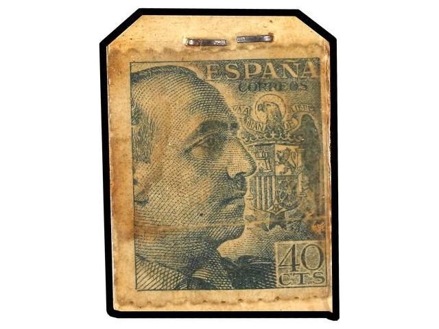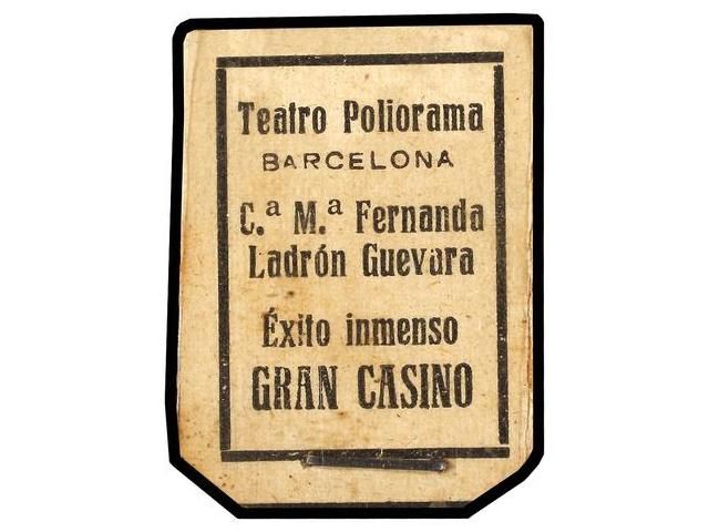 40 Céntimos. Emisión de Postguerra. TEATRO POLIORAMA BARCELONA. Anv.: Éxito inmenso/GRAN CASINO. Cartulina con sello de Correos de 40 cts. de Franco en reverso, protegido por celuloide cosido con una grapa. MUY RARO. L-No cat. EBC.