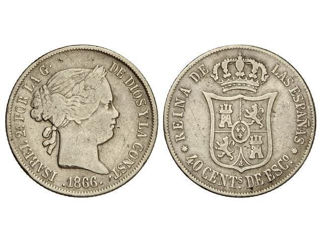 40 Céntimos de Escudo. 1866. SEVILLA. (Golpecitos y rayitas). Cal-342. MBC-.
