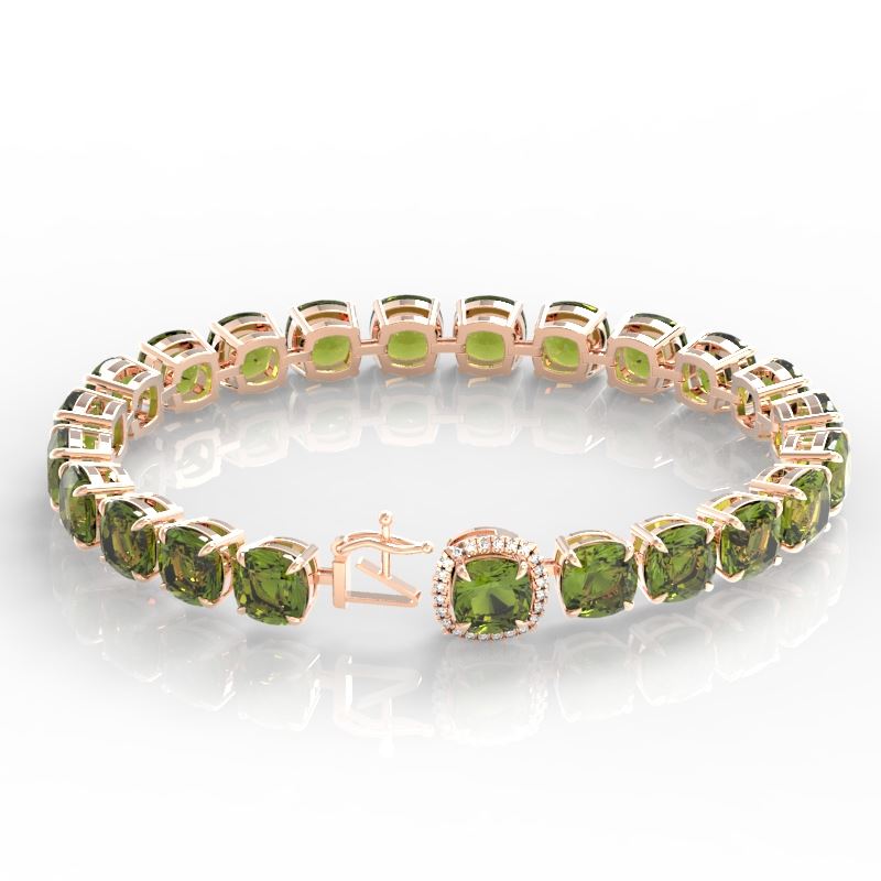 REF-404K4W -23313 ---- 40 CTW Green Tourmaline & Micro VS/SI Diamond Halo Bracelet 14K Rose Gold ---- Luxury Designer Brand Bracelet Appraised at $26,700 Certificate Number US23313 14k Rose gold, Bracelet Size is 7 Inches, Bracelet measuring approx. 9 mm x 7 Inches, weighing in total approx. 14 grams. Made in the USA and is stamped 14k, Main stone 39.75 carat total weight containing 22 pieces of Saturated Green color with AAA quality Cushion shape cut Green Tourmaline , Stone #2 0.25 carat total weight containing 24 pieces of H-I color with VS/SI quality Round shape cut Diamond