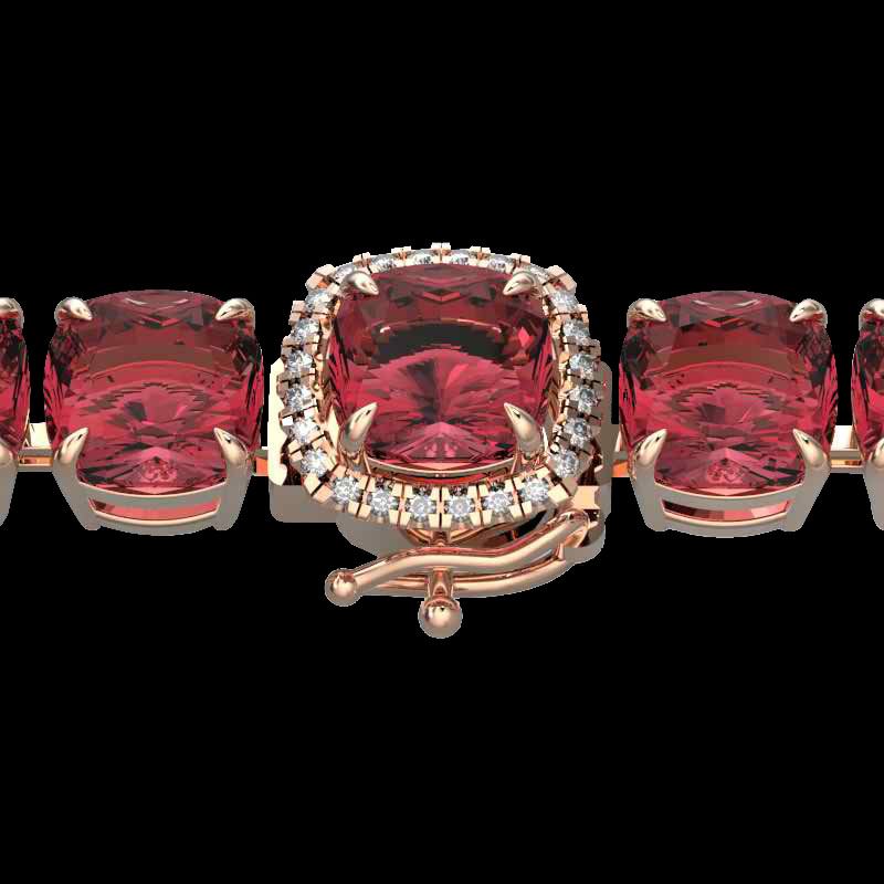 40 CTW Pink Tourmaline & Micro VS/SI Diamond Halo Bracelet 14K Rose Gold ---- Luxury Designer Brand Bracelet Appraised Retail Price at $34,050 ---- SKU Number US23320 14k Rose gold Bracelet Size is 7 Inches, Bracelet measuring approx. 9 mm x 7 Inches, weighing in total approx. 14 grams. Made in the USA and is stamped 14k, Main stone 39.75 carat total weight containing 22 pieces of Reddish Pink color with AAA quality Cushion shape cut Pink Tourmaline , Stone #2 0.25 carat total weight containing 24 pieces of H-I color with VS/SI quality Round shape cut