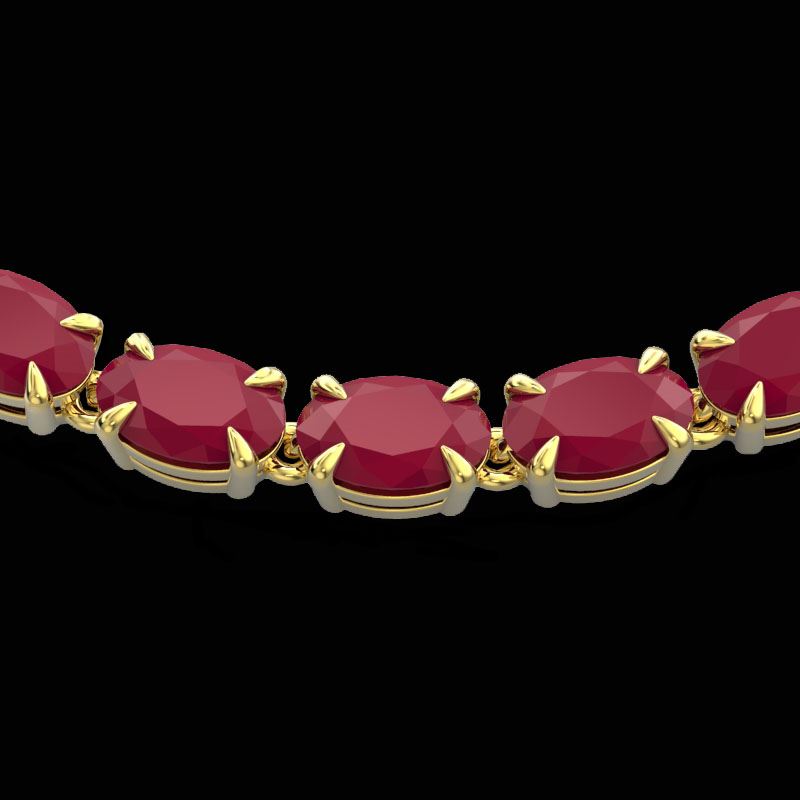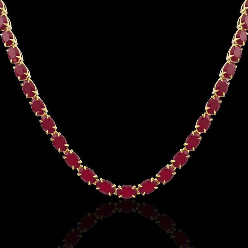40 CTW Ruby Eternity Tennis Necklace 14K Yellow Gold ---- Luxury Designer Brand Necklace Appraised Retail Price at $16,800 ---- SKU Number US23380 14k Yellow gold Necklace Size is 16 Incehs, Necklace measuring approx. 6 mm x 16 INCHES, weighing in total approx. 19 grams. Made in the USA and is stamped 14k, Main stone 40.00 carat total weight containing 57 pieces of Mid-Opaque-Deep Red color with AAA quality Oval shape cut Ruby , Stone #2 carat total weight containing pieces of color with quality shape cut