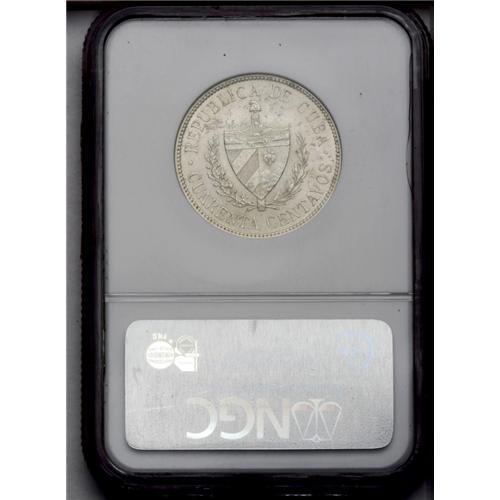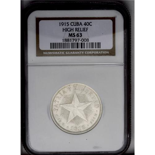 <B>Republic 40 Centavos 1915,</B></I> high relief star, KM14.1, MS63 NGC. Full luster with light abrasions and a hint of golden toning.