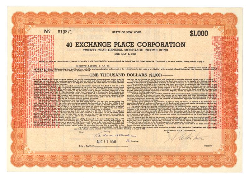 1958, New York. Bond for $1000. Orange with orange overlay. Perferation cancelled. Very fine.