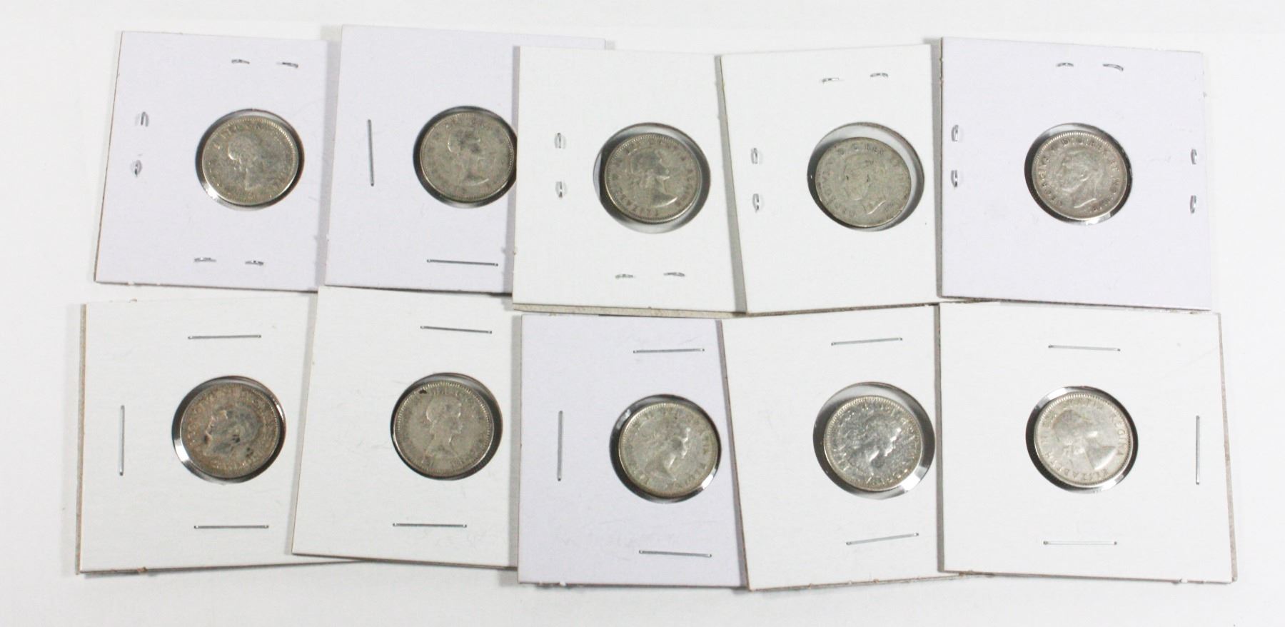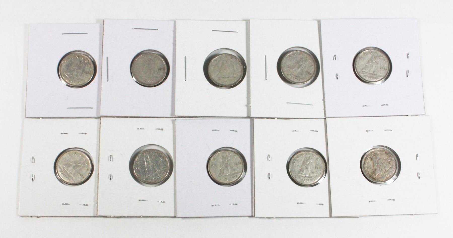 ASSORTED YEARS 1943 1944 1955 1957 1960 1961 ETC LOT OF 10 CANADIAN CANADA SILVER COINS KING GEORGE VI AND QUEEN ELIZABETH II QEII
