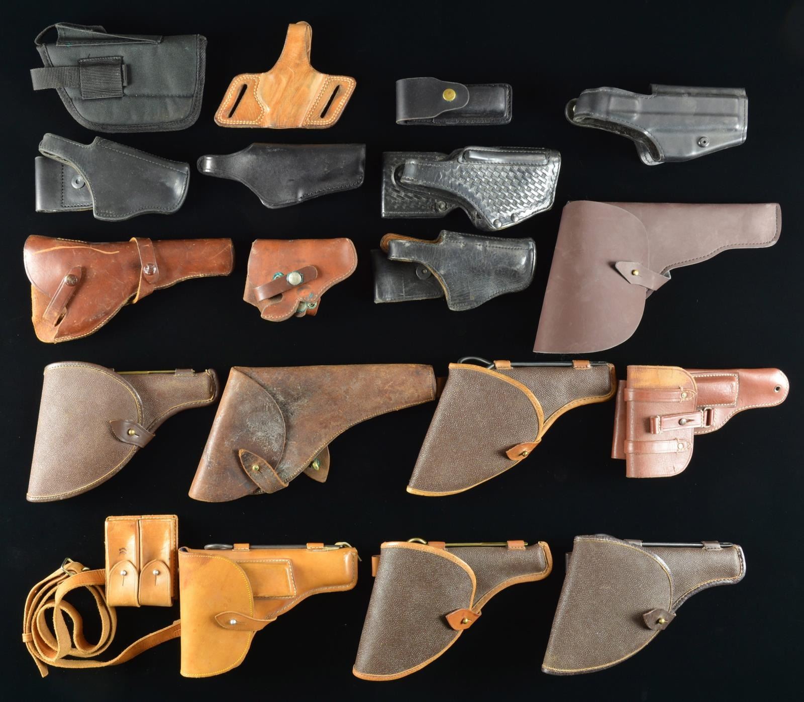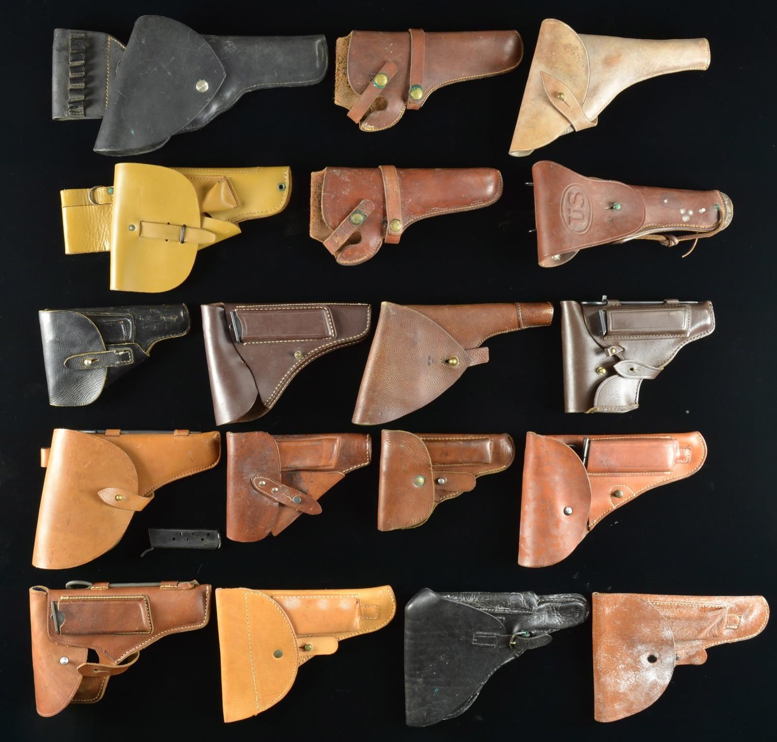 A wide variety of holsters w/ notable examples including: Holster for Hungarian Model 37 Femaru marked "jsd / 1942".
