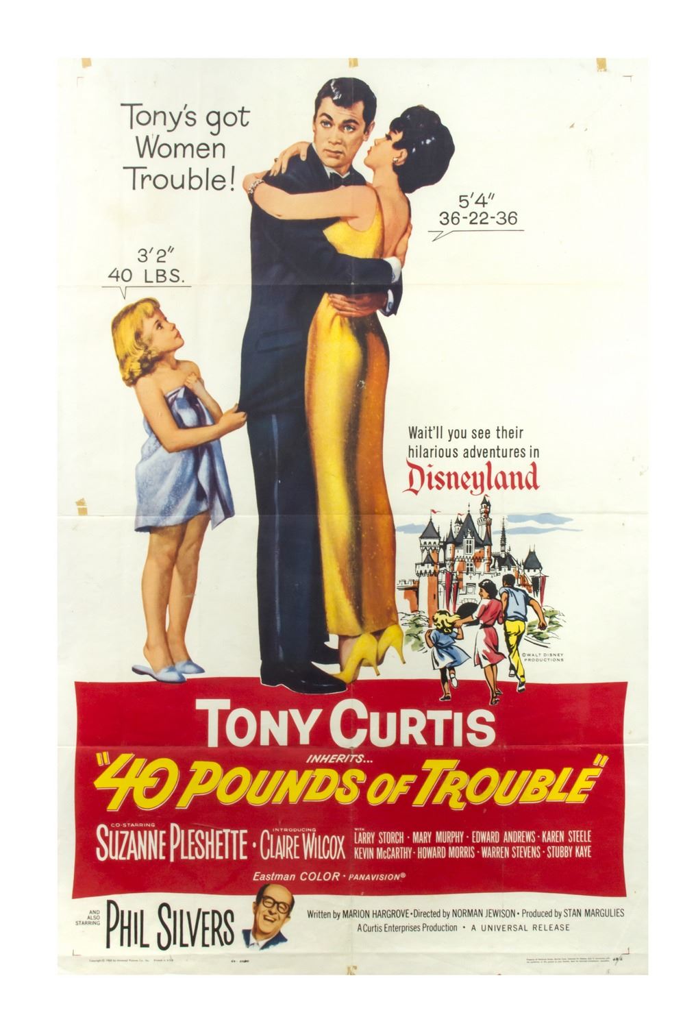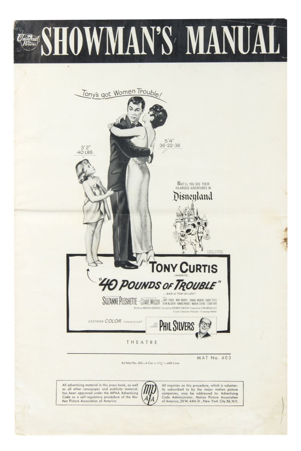 (Disneyland, 1962) A theatrical poster and Press Book for the 1962 feature film "40 Pounds of Trouble". This film, although produced and distributed by Universal Studios, includes a trip to Disneyland (a wonderful piece of marketing by Walt Disney). Starring Tony Curtis and Suzanne Pleshette, the film features a fantastic look at some of the original attractions and entertainment found at the park during its early years, including arrival by the Los Angeles Airways Helicopter Service. The poster features the principal cast as well as an illustration of Disneyland's "Sleeping Beauty Castle". The press book offers 16-pages of information and photos relating to the film. The poster measures approximately 41"x27" while the press book measures 18"x12". Both items are in good condition with some wear throughout from use, including a few small tears and some spots of minor discoloration from use.