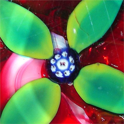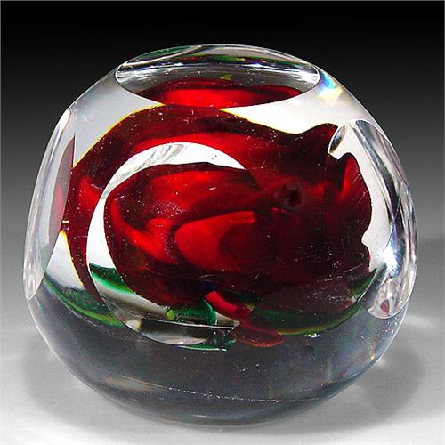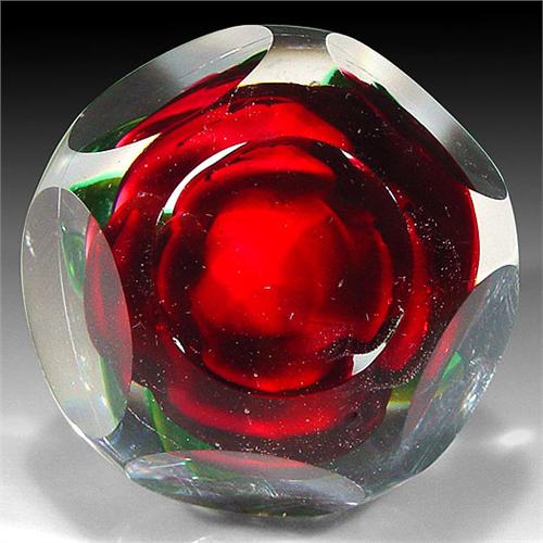 Ronald Hansen faceted red rose paperweight, with an upright dark red rose and four green leaves. Five and one facets. "H" signature cane under the flower. Diameter 2 1/4". NO RESERVE