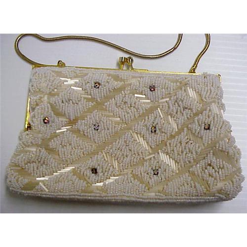 Gorgeous vintage purse, Hand made displaying lovely beaded pattern and beautiful iridescent rhine stones with pink-ish hue.Hand made in Hong Kong(orig. label on inside).Love the pleasant weight leaden with gorgeous cool beads.Excellent condition nice and clean on outside, lining shows use and there is only one rhine stone missing, which could be replaced very easily.This is a lovely purse perfect addition for a serious collector.US Buyer please pay 7.00 for shipping plus insurance, Thank You very much for looking!