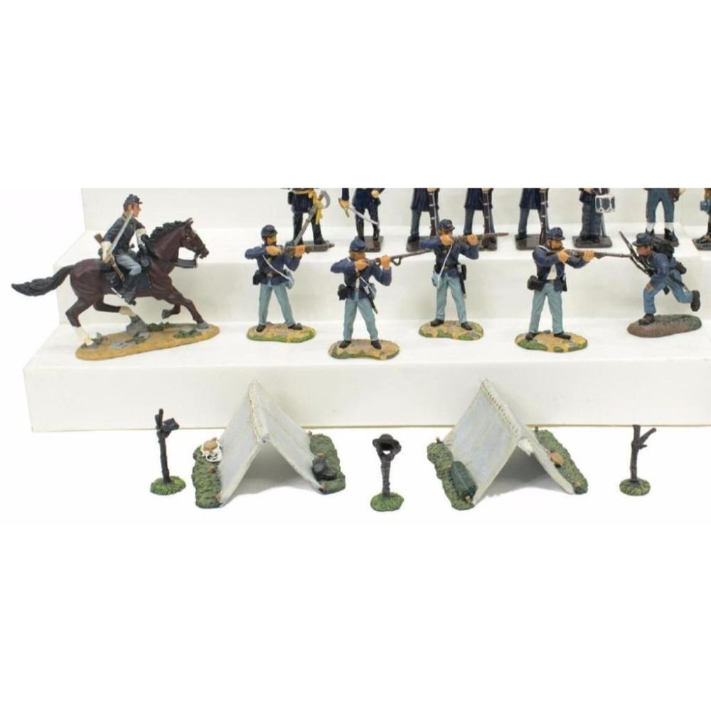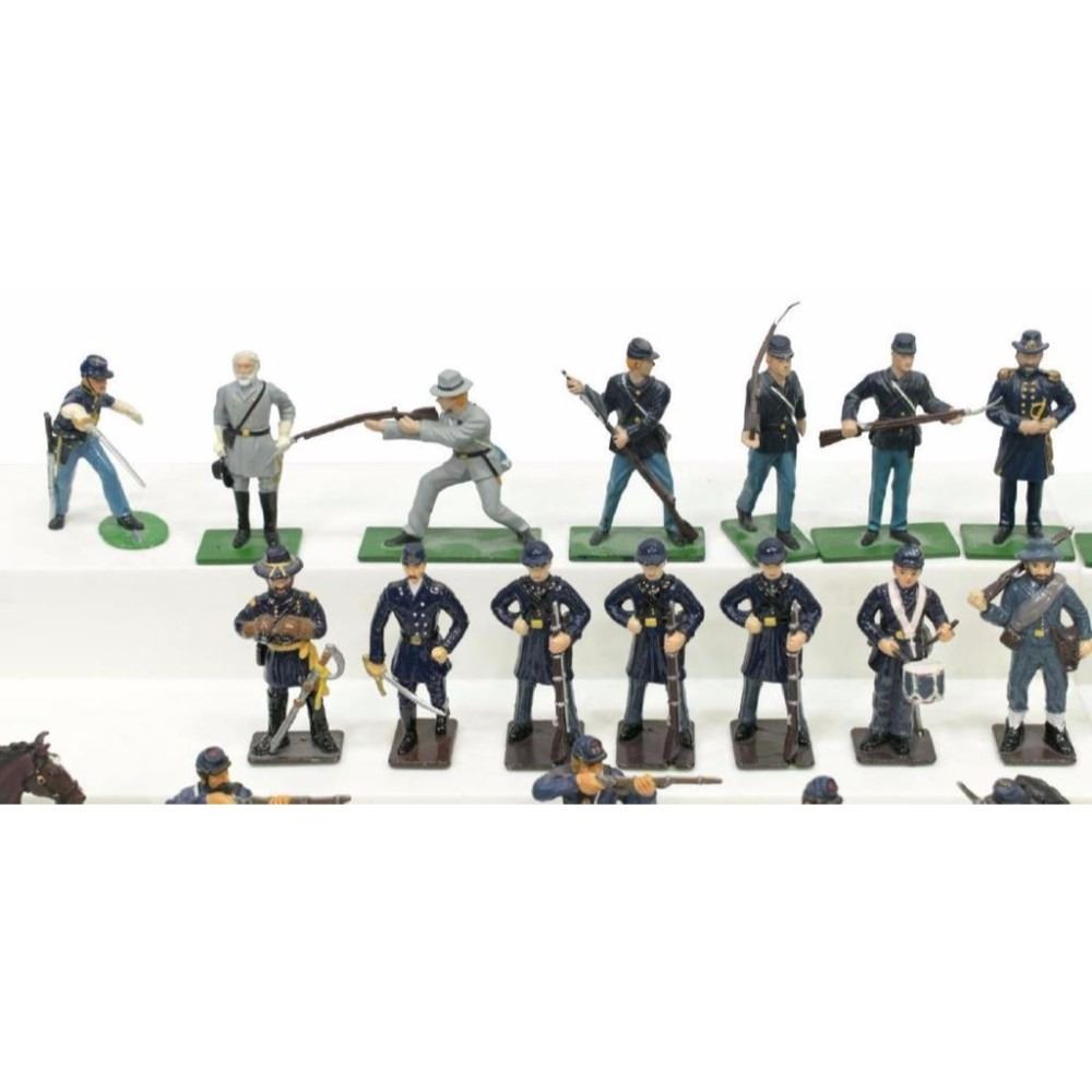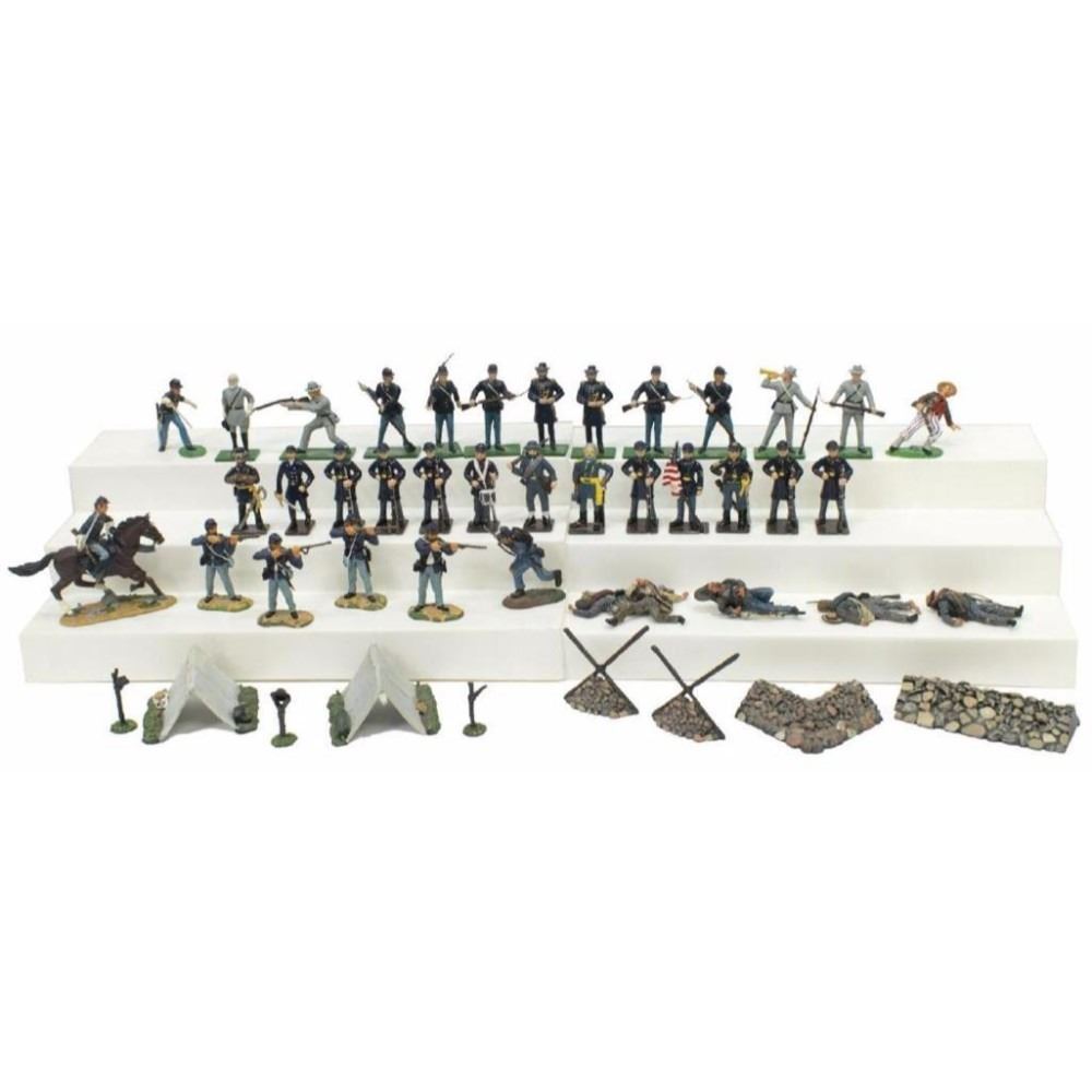 (lot of 40) Metal U.S. Civil War soldier miniatures: (1) , Union Cavalry Private #4 by Ertl Collectibles, appears as new in original box, 3.25"h; (4) "Fight'n Irish", Union foot soldiers, by Ertl Collectibles, appears as new in original box, 2.5"h; (2) Civil War pup tents by William Britain, #17440, appear as new in original box; (1) Snake Rail Fence, four pieces, by William Britain, #17149, appears as new in original box; (5) Confederate Dead by Miniatures of the Ages, appears as new in original box; (2) "Hand to Hand", dismounted trooper and Louisiana Zouave by Trophy Miniatures, appears as new in original box; (19) Union soldiers; (6) Confederate soldiers, largest box: 2.5"h, 12"w, 5"d, total: 6.5lbs