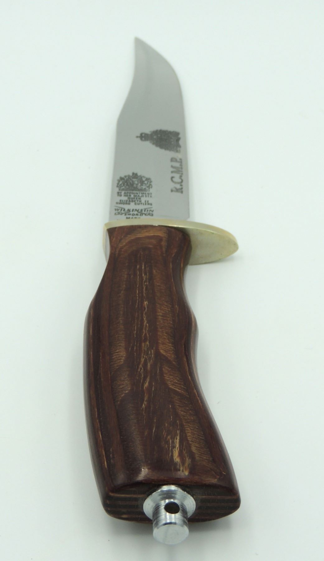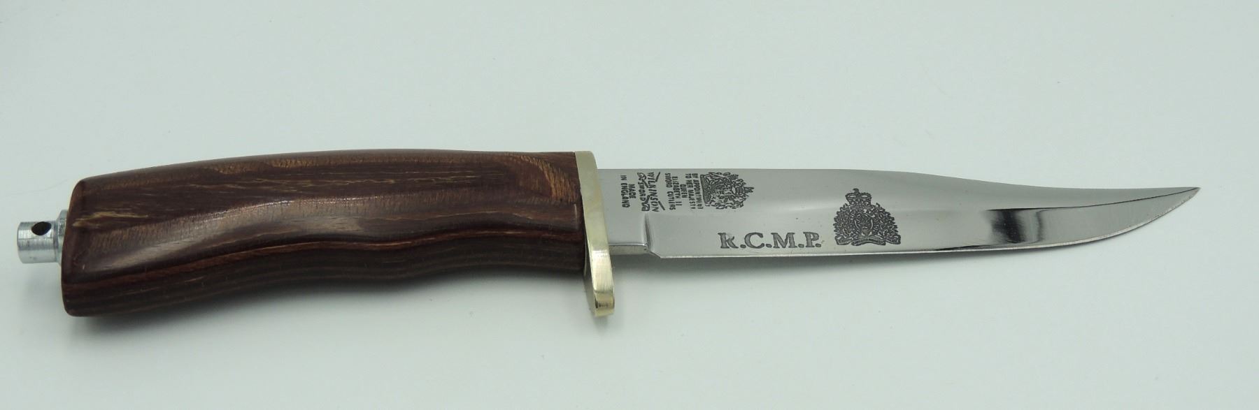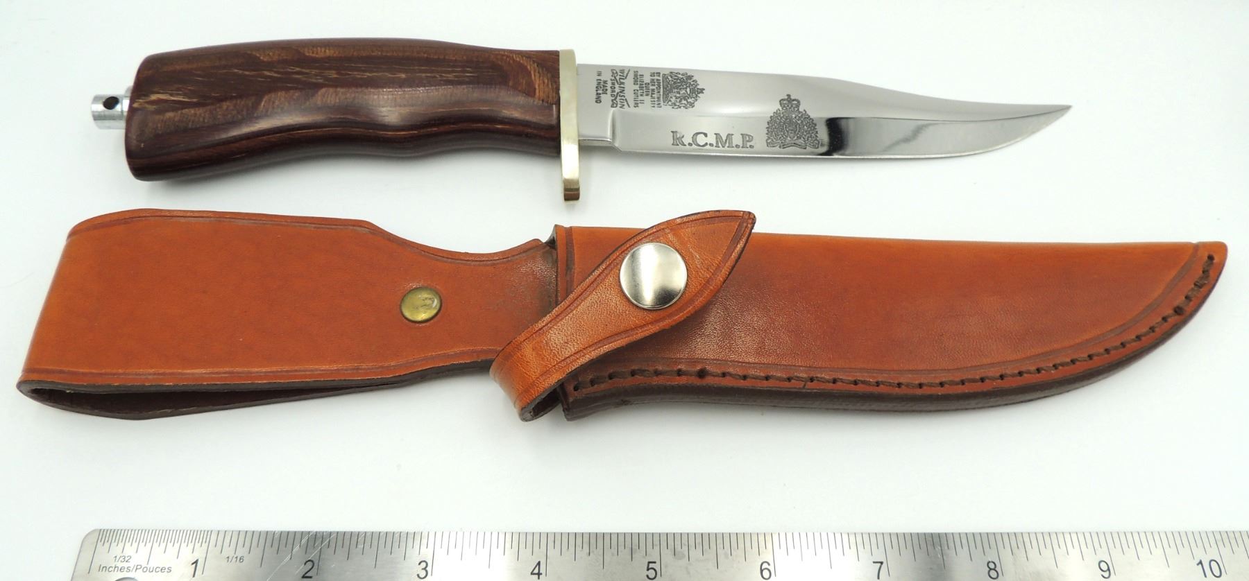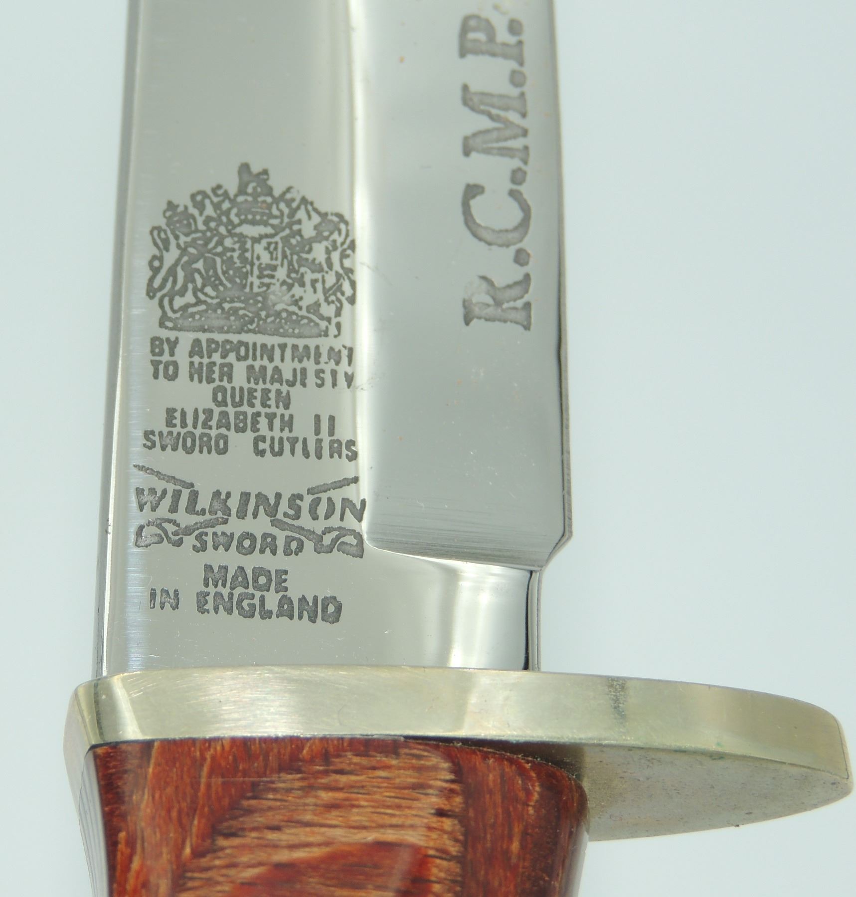 Produced in 1978, Avaliable only to Members of the Wilkinson Sword Collectors Association. Commemorative Royal Canadian Mounted Police Hunting and Skinning Knife, Wood Handle With Chromed Blade.With Royal Canadian Mounted Police Queens Crown Cap Badge Design. Seldom Seen.