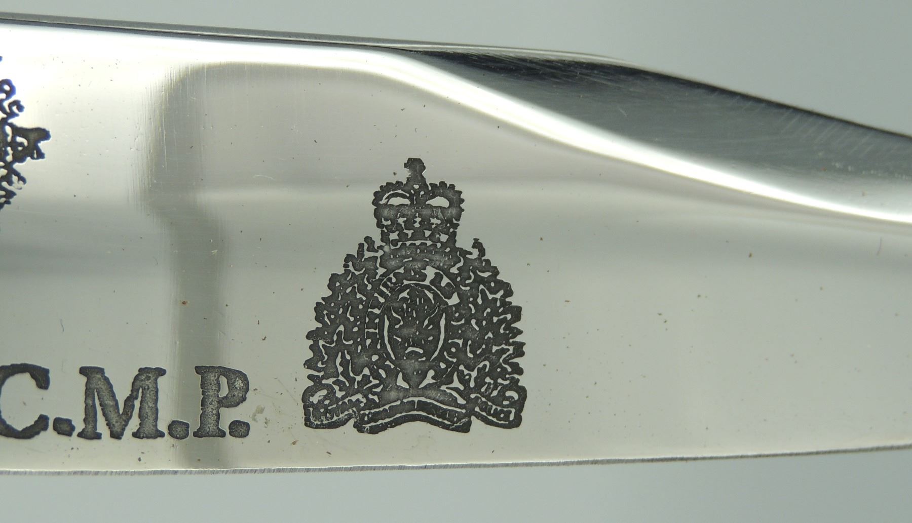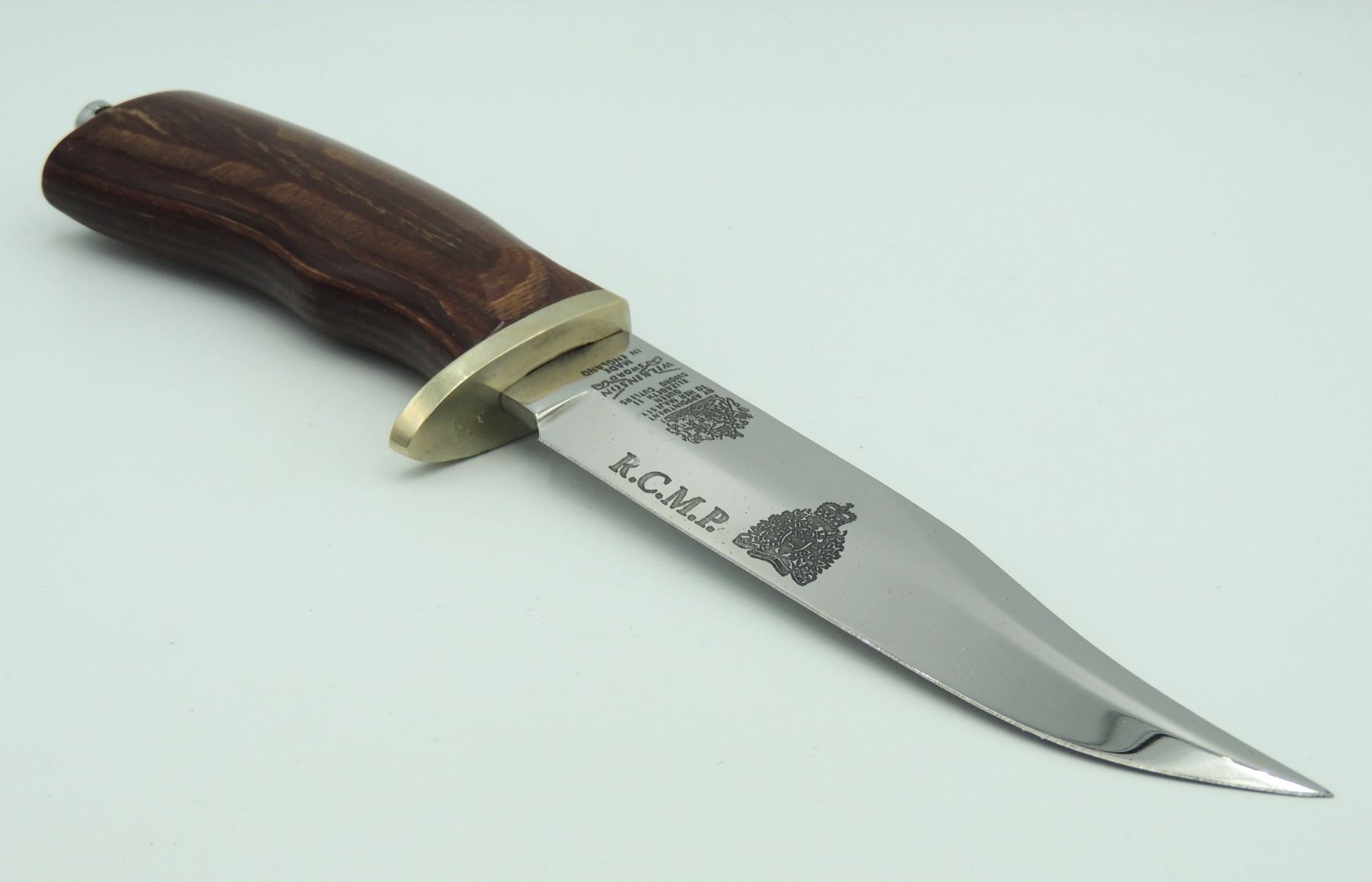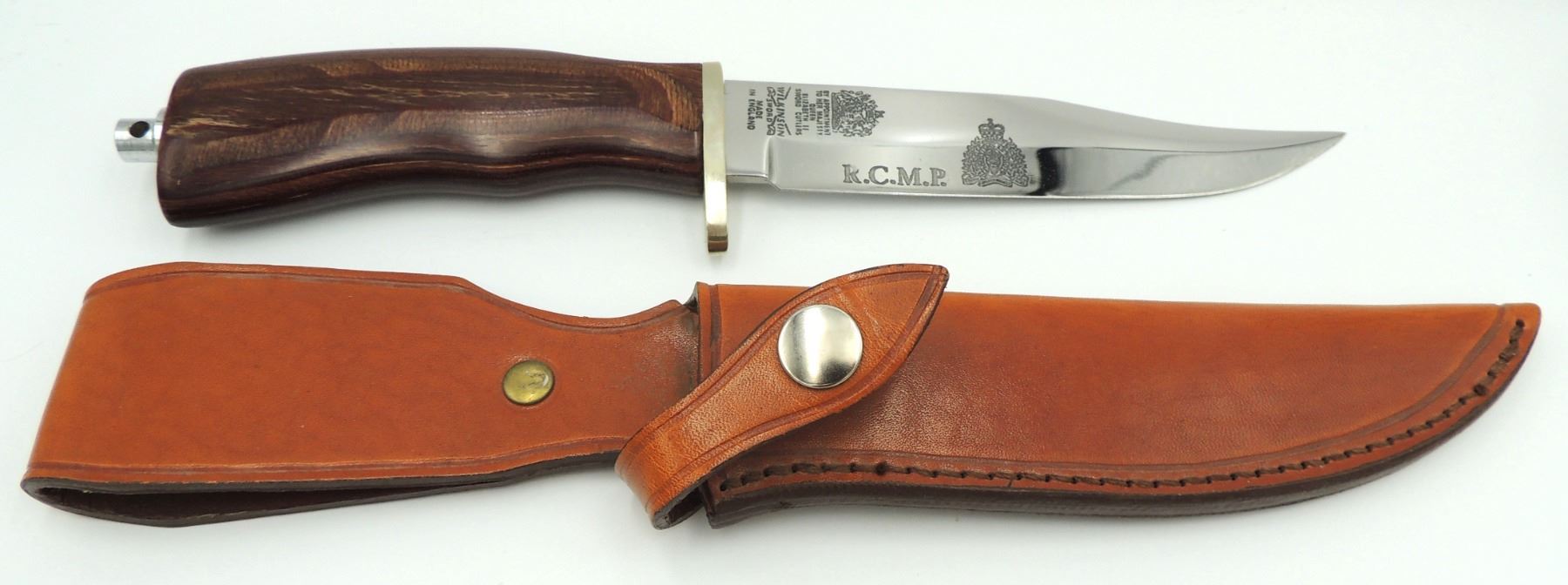 Produced in 1978, Avaliable only to Members of the Wilkinson Sword Collectors Association. Commemorative Royal Canadian Mounted Police Hunting and Skinning Knife, Wood Handle With Chromed Blade.With Royal Canadian Mounted Police Queens Crown Cap Badge Design. Seldom Seen.