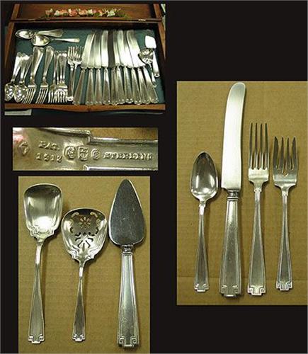 40 oz set of Gorham Etruscan, service for ten knives, salad forks and dinner forks. 13 spoons, 1 sugar shell, 1 pierced spoon, 1 cake server. No monograms