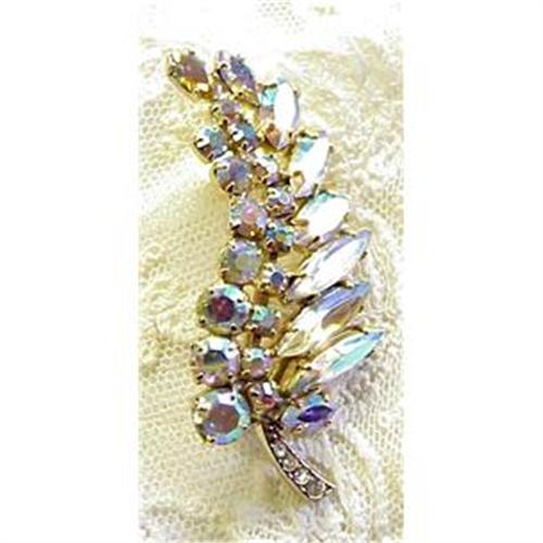 Lovely 1940 rhine stone brooch, set with mirror like iridescent color stones, each stone securely held with gold tone claws.This broch is made in 2 tiers depicting lovely gem like leaf. VERY WELL made and it is a treasure.Excellent condition and it measures over 2 1/2" long".Not signed.US Buyer please pay 6.00 for shipping + insce.Thank You for looking!