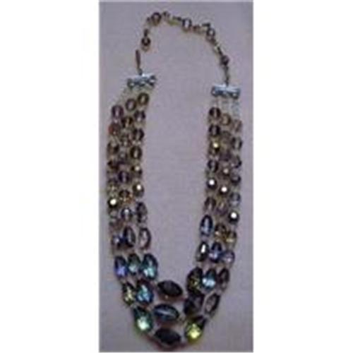 </font></strong>BEAUTIFUL 3 STRAND NECKLACE, MADE FROM GRADUATE SIZES OF HIGHLY FACETED CRYSTAL, THE COLOR IS DIFFICULT TO DESCRIBE SINCE IT CATCHES THE LIGHT AND ALL COLORS THAT'S NEAR BY, I SEE BLUE, GREY. GREEN. AMBER COLOR EVEN RED. IT IS AMAZING - please see our images - Excellent condition, measures about 15 1/2" long - US Buyer to pay 7.00 for shipping plus insurance.THANKS.</font>