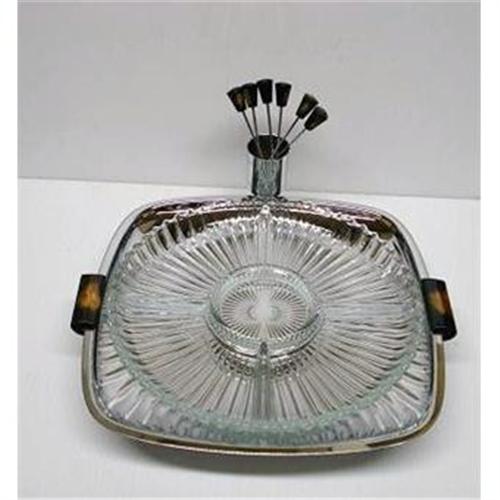 WONDERFUL 8 PIECE SERVING DISH, CONSISTING FROM SQUARE DISH WITH ROUND "FITTING" GLASS SECTIONAL LINER, AND 6 SMALL SPECIAL "FORKS", chrome DISH STANDS ON 4 DECO STYLE BLACK/AMBER BAKELITE LEGS AND 2 HANDLES MADE FROM THE SAME BAKELITE, EACH TINY "FORK" HAS A SHORT BAKELITE HANDLE - AS PER IMAGES - Excellent condition, it seems hardly or never used, The dish has original sticker which reads Gourmates - styled by Glo-Hill - Canada, Dish measures about, from handle to handle 12 1/4" x 11 1/2" it stands 2" high, Round glass dish measures about 10" in diam., and each fork measures about 4 1/4" long - US Buyer to pay 12.00( VERY HEAVY) for shipping plus insurance.THANKS.