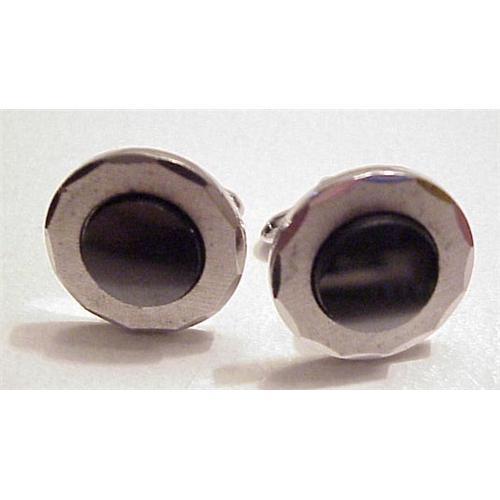 1940's Art Deco man's cufflinks - silver finish - etched edge and a lovely round stone what it looks like black Alaska diamant - Made by Swank - Each measures: 3/4" in diam. - Please include 7.00 for shipping and insurance - Thanks!