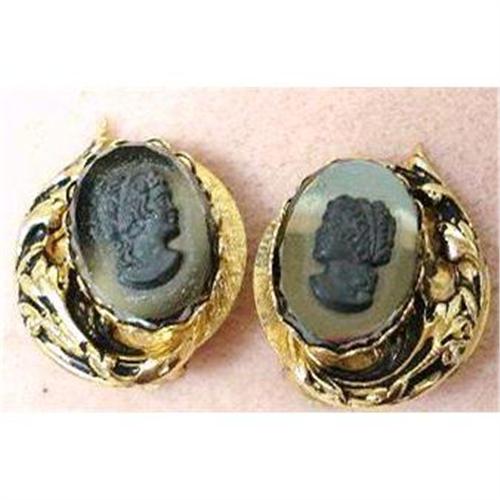 HIGH QUALITY PAIR OF HEMATITE CLIP-ON EARRINGS DEPICTING BLACK CAMEO PROFILES SET IN ORNATE GOLD TONE "FRAMES",as per images,BEAUTIFUL UNIQUE STYLE, VERY ELEGANT! each measures about 1 1/4" - it comes in excellent, mint condition,US Buyer to pay 7.00 for shipping plus insurance,THANKS.
