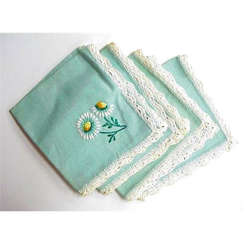 Gorgeous set of 4 linen napkins,with crocheted lace border and pretty embroidery on a fresh mint green linen - US Buyer please pay 4.00 for insured shipping - Thank You very much for looking!