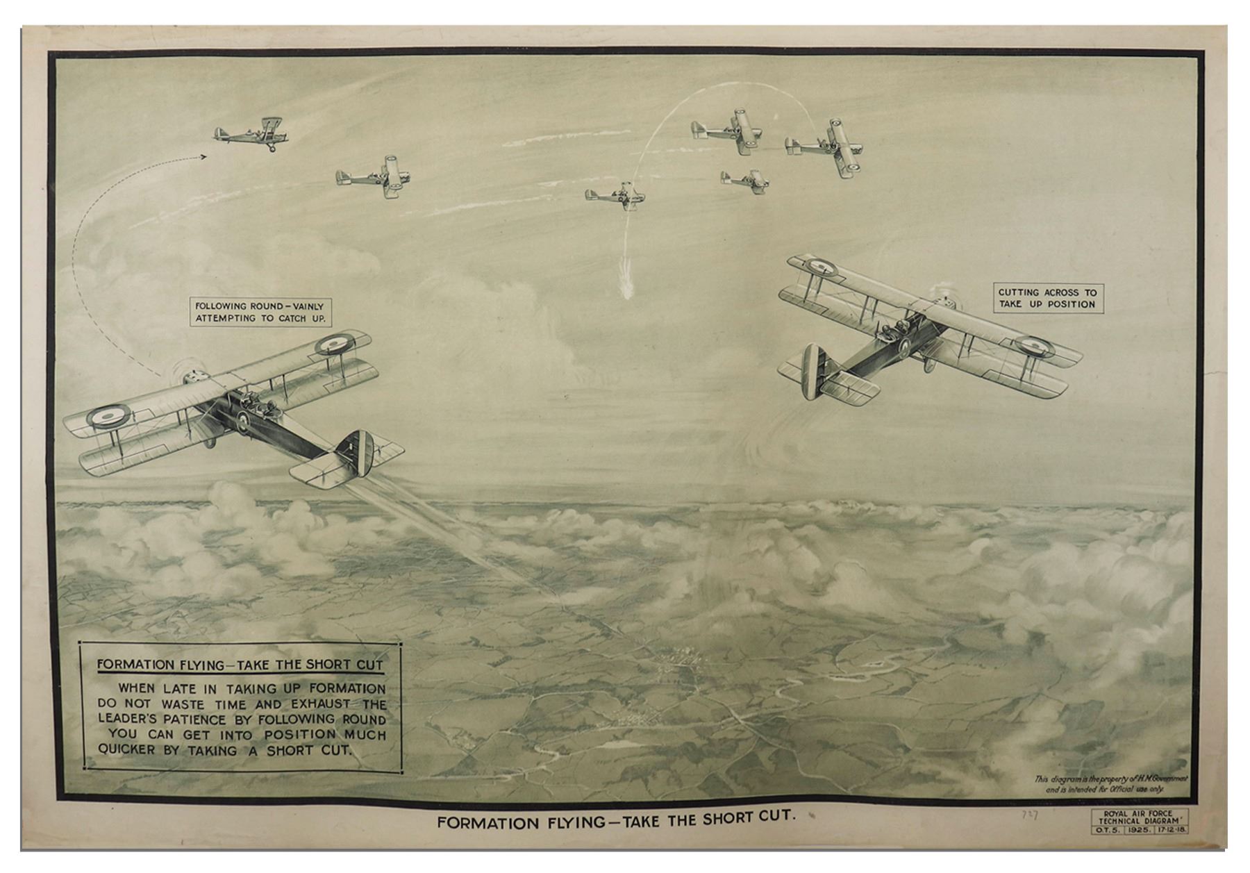Rare large-format Royal Air Force lithograph poster, designed to train World War I pilots the basics of flight. With the Wright Brothers having only completed their public airshows a decade earlier, a mastery of aviation - let along combat flying, was uncharted territory. Poster entitled ''Formation Flying - Take the Short Cut'' teaches pilots how to quickly get into formation with other British aircraft. Published by Air Technical Services, dated 17 December 1918. With Air Ministry and Royal Air Force stamps on verso. Two-tone lithograph measures 40'' x 27''. Light wear, and some closed tears, all confined to margins. Very good condition.