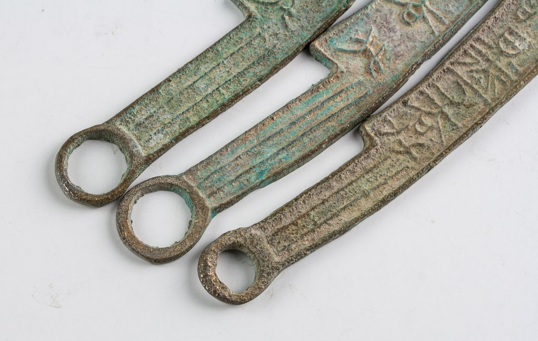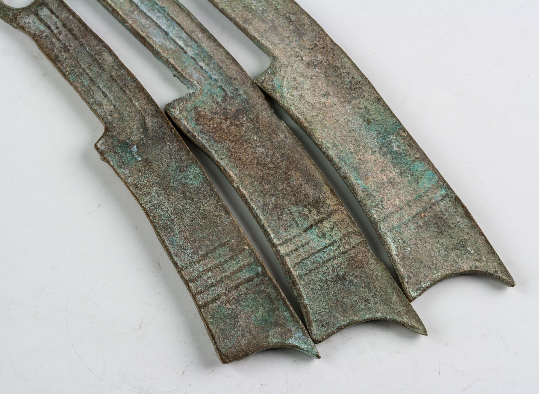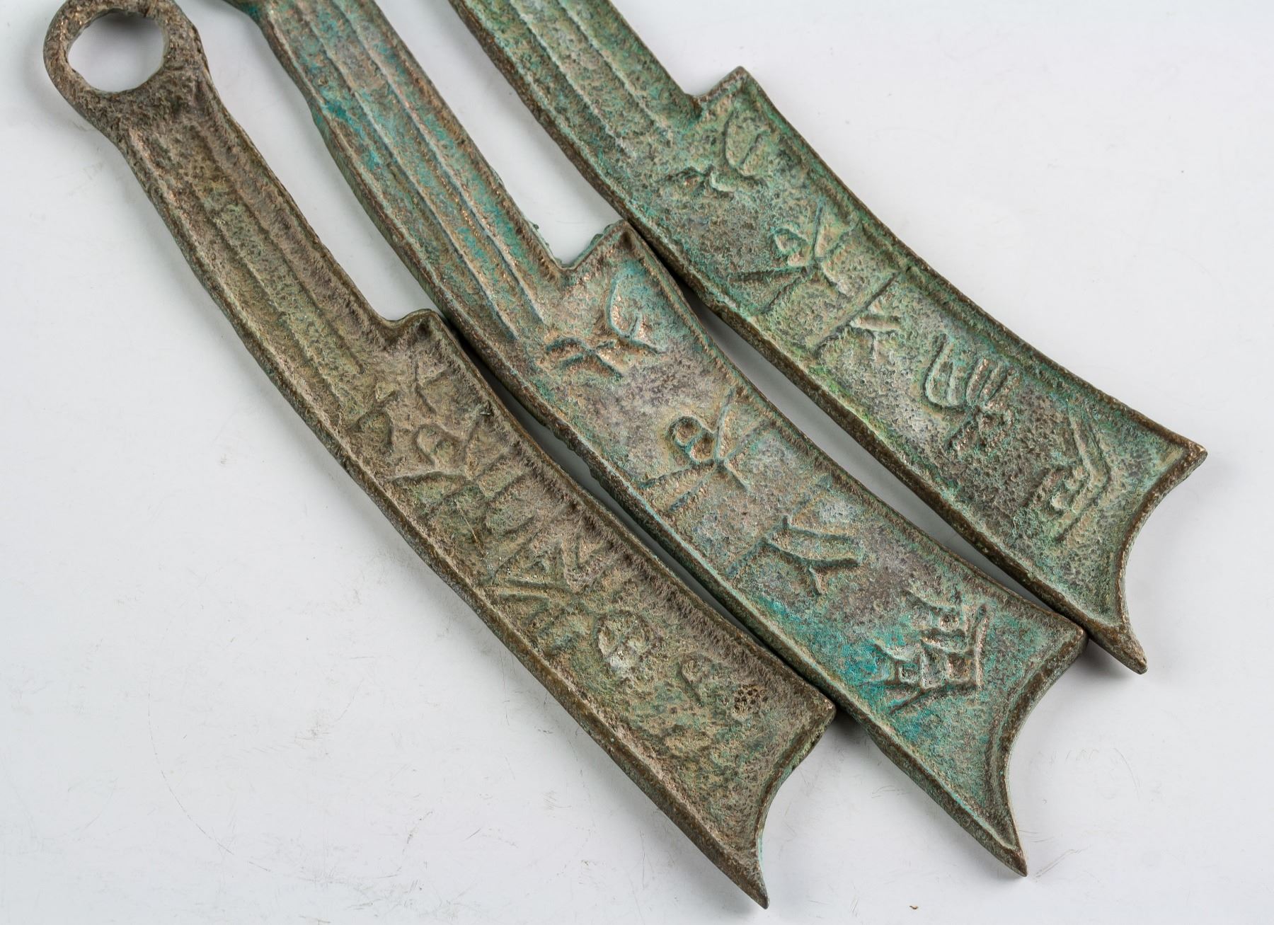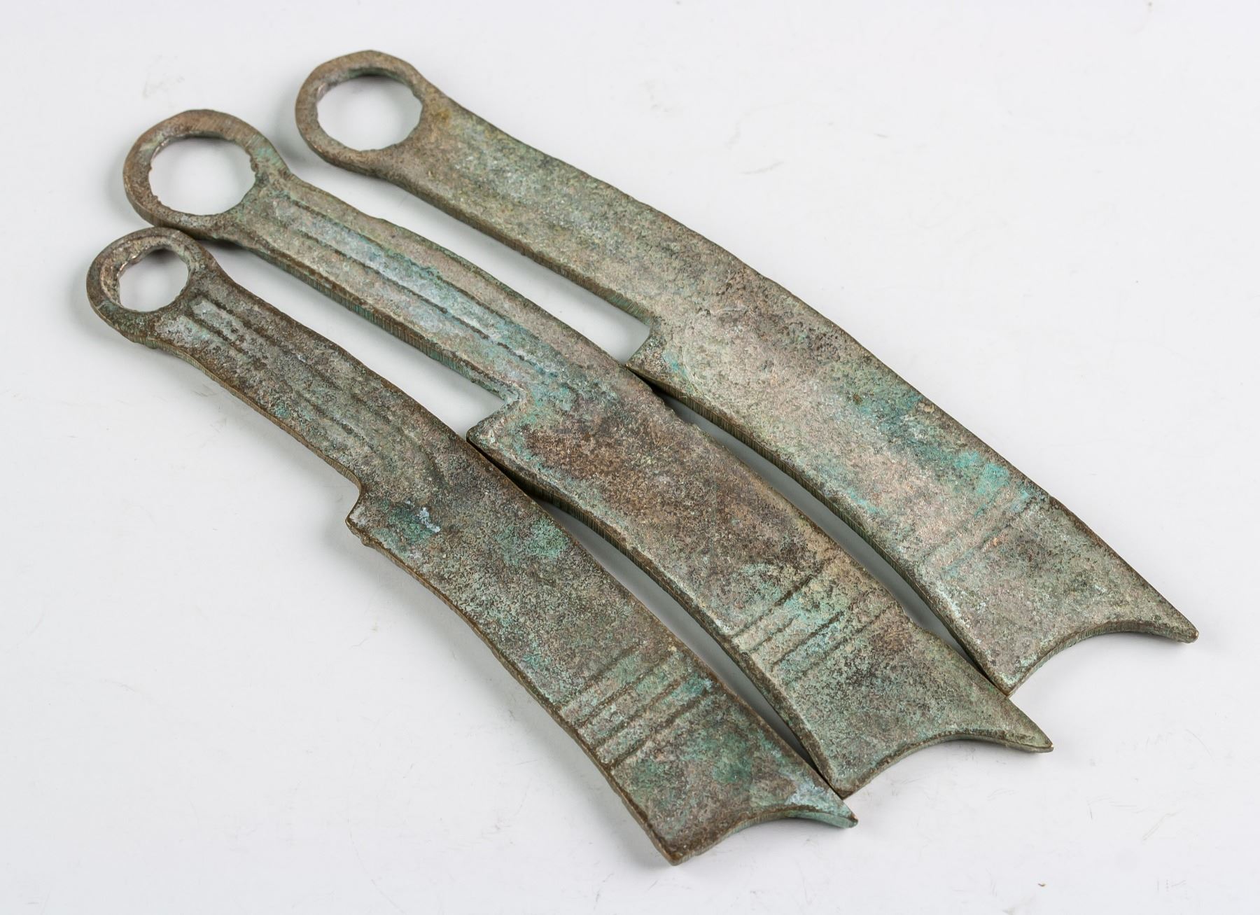 3 assorted 400-220 BC Chinese Qi State bronze knife money, one lettering An Yang Zhi Fa Hua, one lettering Ji Mo Zhi Fa Hua, one lettering Qi Zhi Fa Hua, L: 120.57-140.72 mm, W: 20.53-22.63 mm, 24.066-27.693 gram.