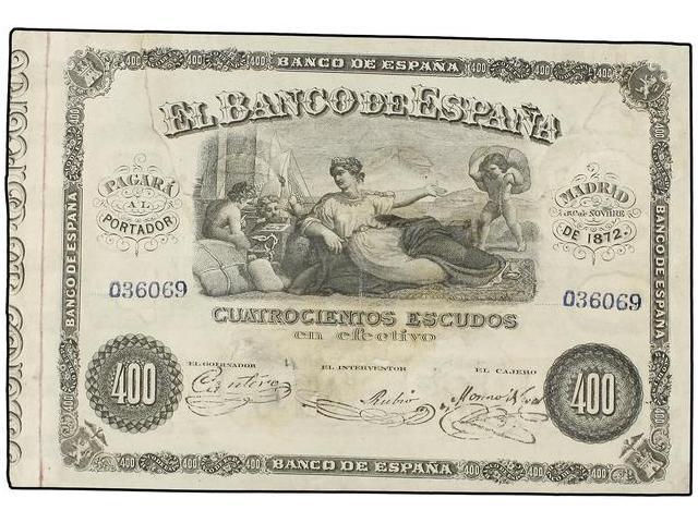 400 Escudos. 30 Noviembre 1872. Seis taladros. (Restaurado). Ed-B38a; LB-38. MBC+.