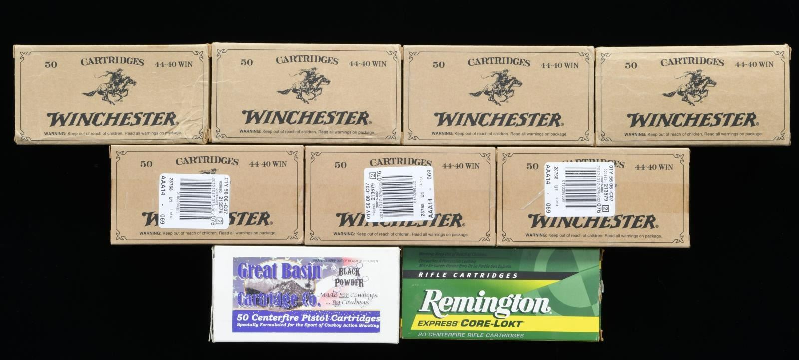 44-40: 325 RDS. (7 BOXES) Win. Cowboy Action Loads 225 gr. lead flat nose. 25 RDS. (1 BOX) Great Bason Cartridge Co. commercial reloaded black powder 200 gr. RNFP; uses variety of cases. 45-70: 20 RDS. (1 BOX) Rem. 405 gr. SP. CONDITION: boxes in good to very good condition; ammo appears serviceable. (02-19804/MD). $150-250.